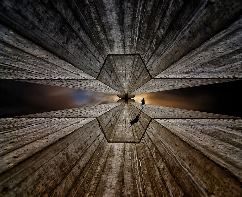 Tak tohle rozhodně není popisná fotka a je úplně jedno, co zobrazuje – snad to jsou zářivky nebo nějaké filtry, nezajímá mě to. Fotka naznačuje blíže neurčenou techniku, diagonálně vedené linie směřují vzhůru a všimněte si, jdou zprava shora doleva dolů, tedy „proti srsti“, proti směru, kterým jsme zvyklí číst. Takto řešené fotky jsou v jakési tónině Dur, dráždí nás, provokují. No a v pozadí je nebe s podivnými mraky a světly. Druhá jeho fotka se jmenuje Epsilon Eridana. Autor ji zveřejnil už na Digiarena.cz a soudě podle komentářů se velmi líbí. Na rozdíl od předešlé fotky je zde uplatněna přísná symetrie.