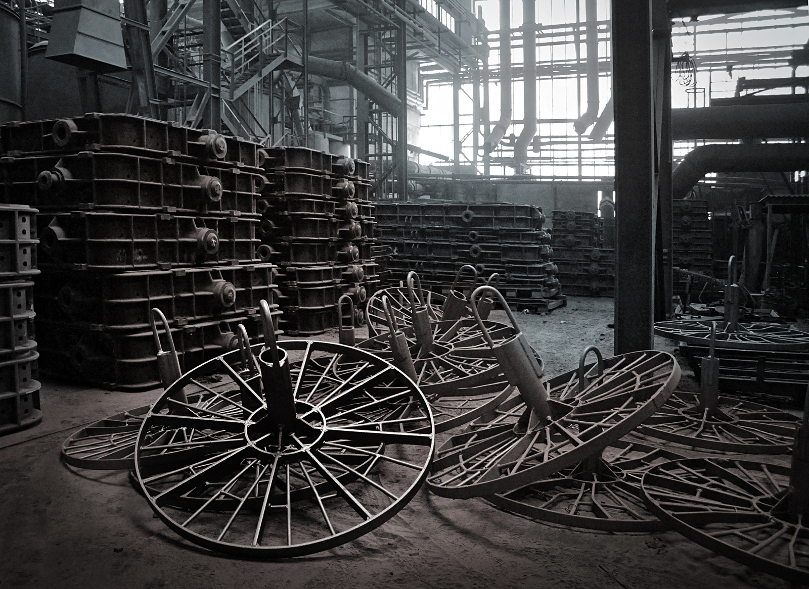 Styově někde jinde je Ocelové město Tomáše Trojana. Je to pohled do opuštěné tovární haly, osvětlené jednak shora, jednak průhledem v pozadí. Název vychází ze slavné verneovky.