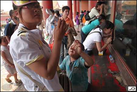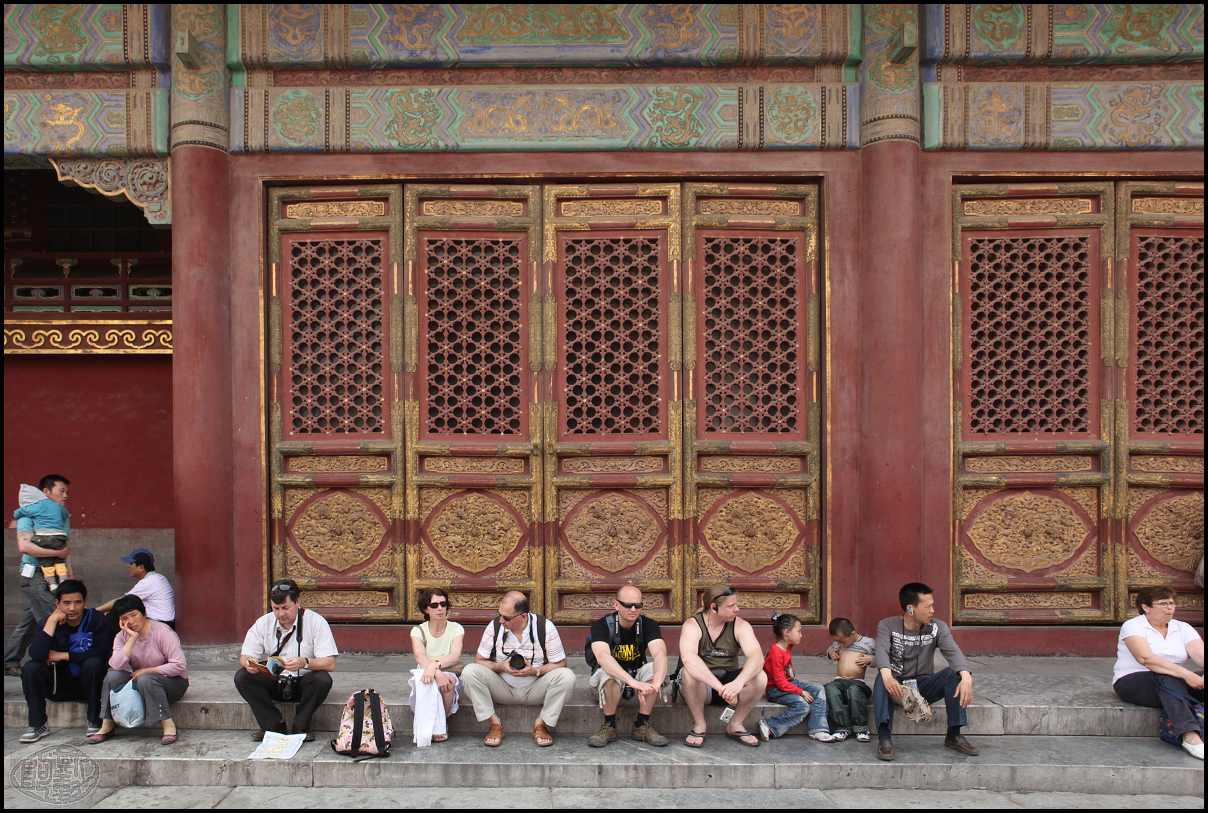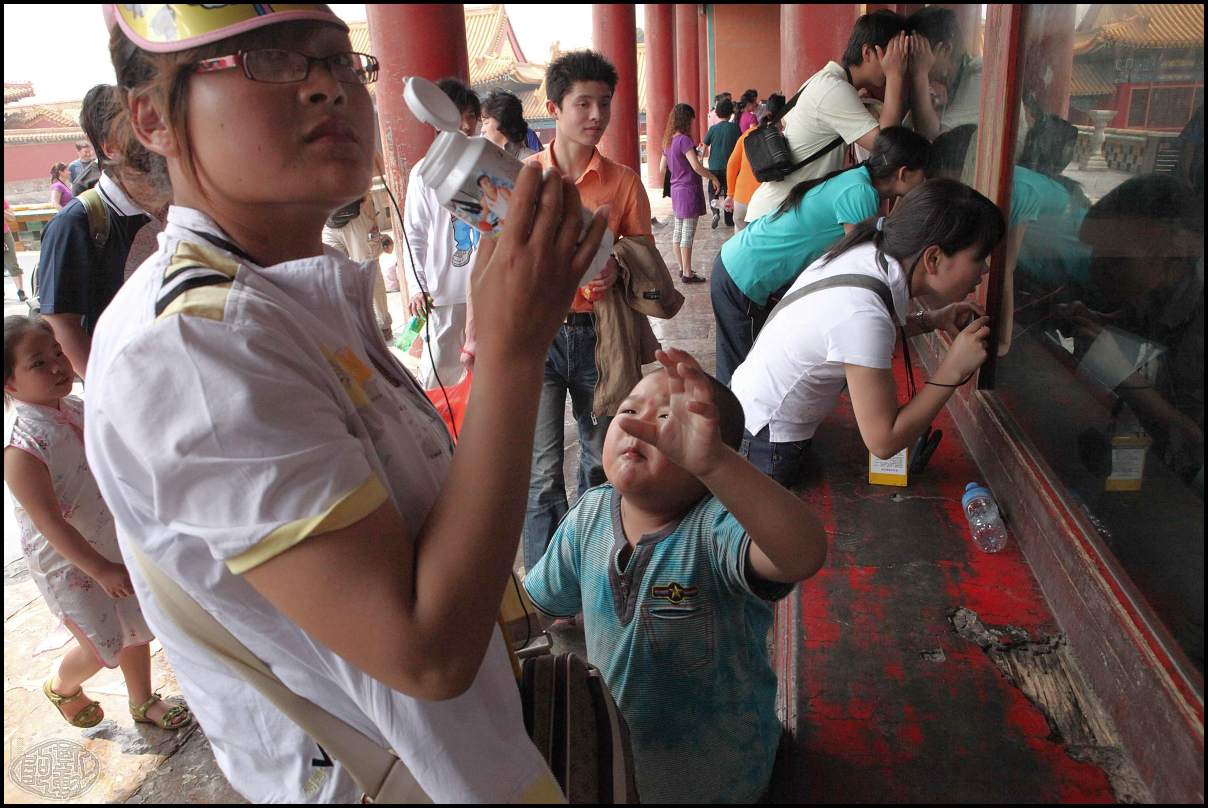 Samozřejmě, je možné soustředit se na turisty a fotit je. V davu se vždycky něco děje. Zaujali mě například lidé, kteří nakukovali dovnitř císařských prostor. Tam se vstoupit nesmí, ten odstup zůstal, takže Zakázané město – v jeho jádru – je dál zakázané. Ono to není ale jednoduché fotit, lidi jsou vám zády, jen zřídka se stane něco, co dá obrázku strukturu. Například zde: