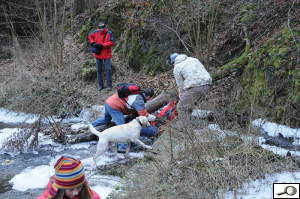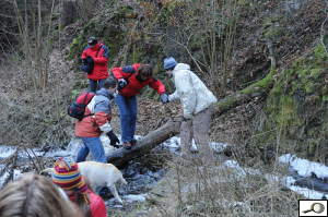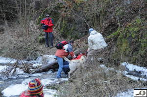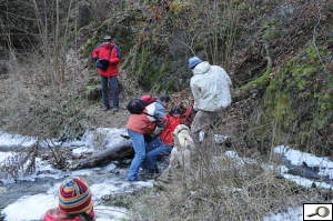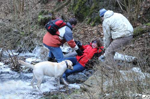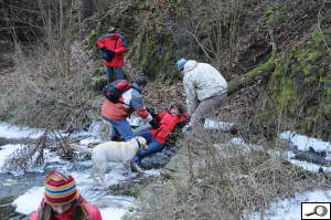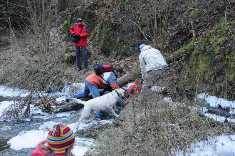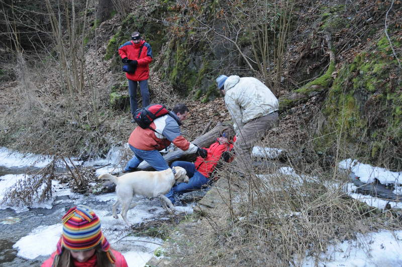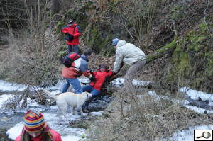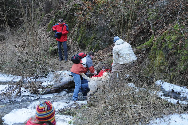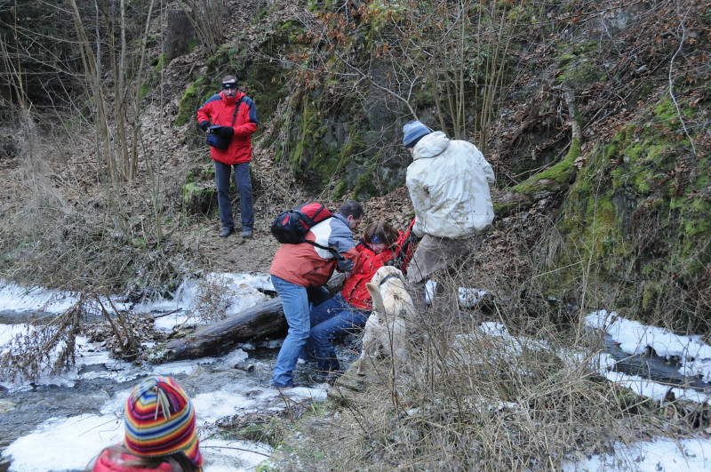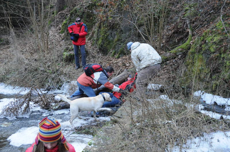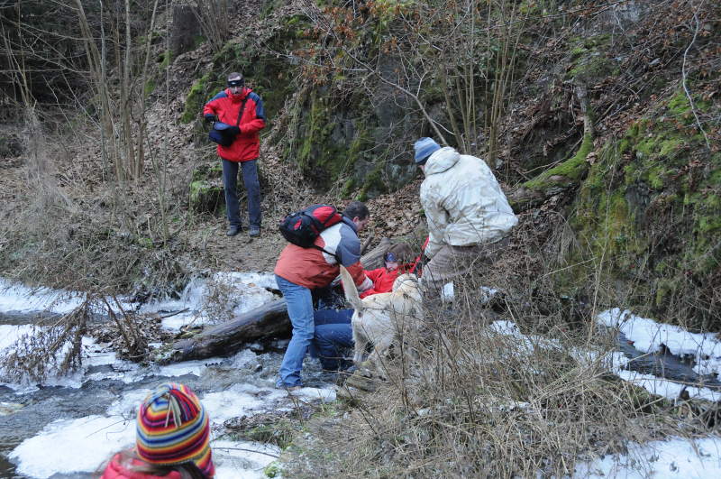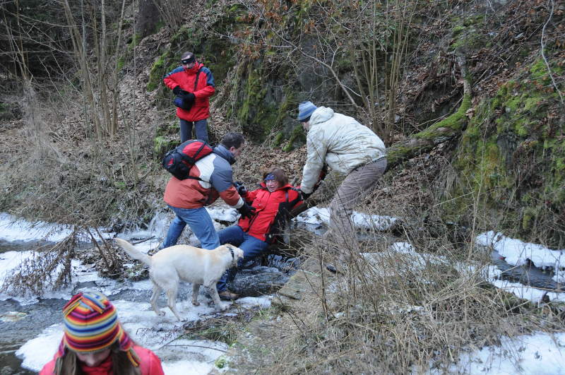 Tady to vypadalo ještě normálně: přátelé pomáhají kolegyni při přechodu přes potok. Trám je kluzký, jak se hned ukáže. I tenhle snímek jsem pořídil při nastavení na sérii, ale stiskl jsem spoušť jen krátce. Ta skutečná série následuje až dole – všimněte si prodlevy mezi prvním a následujícím záběrem. Pak už to jde velmi rychle.