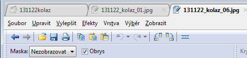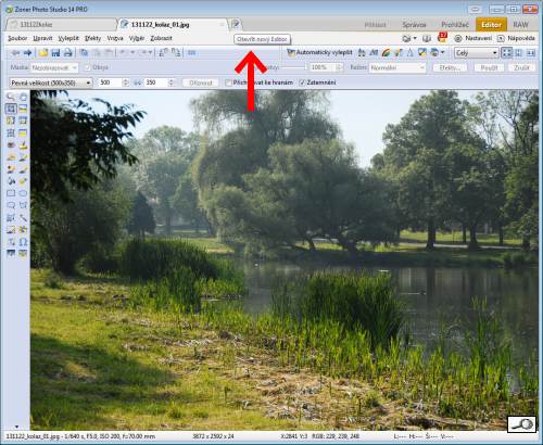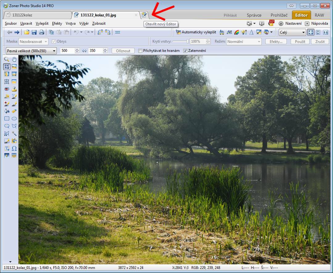 Nejdřív si vše uspořádám. Vyberu si fotky, které mají v koláži být, zvolím tu, která bude dělat pozadí – logicky, v tomto případě, kresebně nevýraznou, toto je rybník na naší návsi. Vše si zkopíruju do zvláštního adresáře a pojmenuji – pro pořádek. V dalším kroku zmenším ty fotky, které budou tvořit výplň na pozadí. Není to sice absolutně nutný krok, ale usnadní práci. Nemusím snad zdůrazňovat, že pracujeme na kopiích, nikoli originálních fotkách! V další důležitém, ba nezbytném kroku otevřu nový editor. Poklepu na nenápadnou ikonku nahoře vedle záložky otevřeného obrázku s pozadím:
