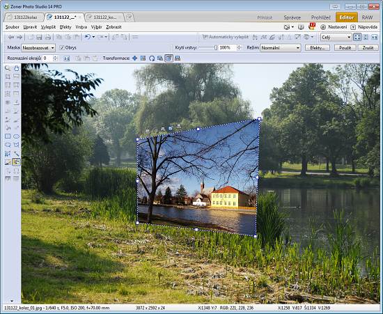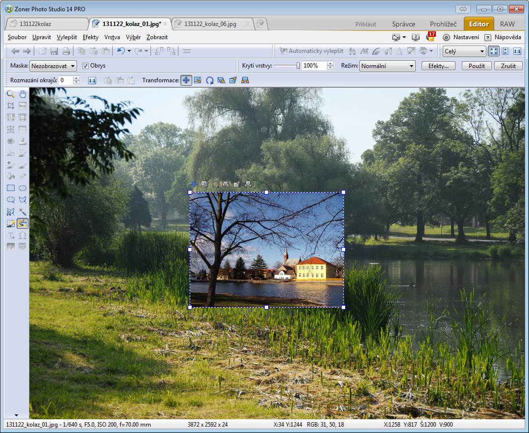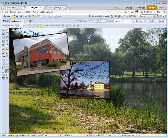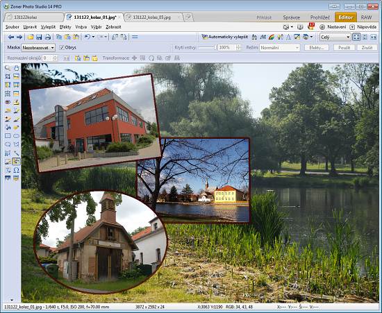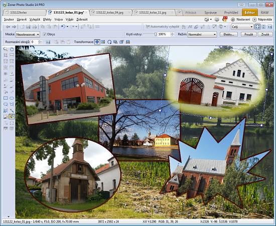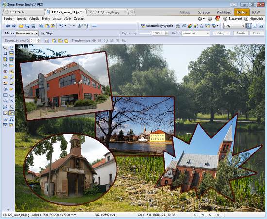 Určitý problém je v tom, že Zoner umí jen jednu pracovní vrstvu. V Photoshopu, v PS Elements, Gimpu či jiných editorech disponujících vrstvami si vrstev můžeme otevřít, kolik potřebujeme a tyto vrstvy v podstatě libovolně přehazovat, upravovat a měnit. To v Zoneru nelze. Tady musíme mít naši koláž dopředu rozmyšlenou. Výsledek by měl vypadat, dejme tomu, takto – jde o jakousi skládanou pohlednici z naší vesnice Zvole.