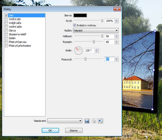 Vyzkoušejte si všechny, zde je volba stín a vpravo vidíte, jak to funguje – určíte si barvu, intenzitu i směr stínu. Já nakonec volil tmavohnědý rámeček (volba obrys). No a v dalším kroku natáhnu do druhého otevřeného editoru další fotku, toto je nábytkářská výrobna firmy Šebek, vložil jsem ji, natočil a orámečkoval postupem naznačeným výše: