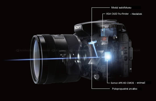 Přístroj patří do unikátní Sony třídy SLT, tedy Single Lens Translucent, není to tedy zrcadlovka v pravém slova smyslu, protože se jeho zrcátko nepohybuje při expozici: zůstává stabilní a je polopropustné. O principu jsem tu už psal, ale neškodí si ho připomenout obrázkem: