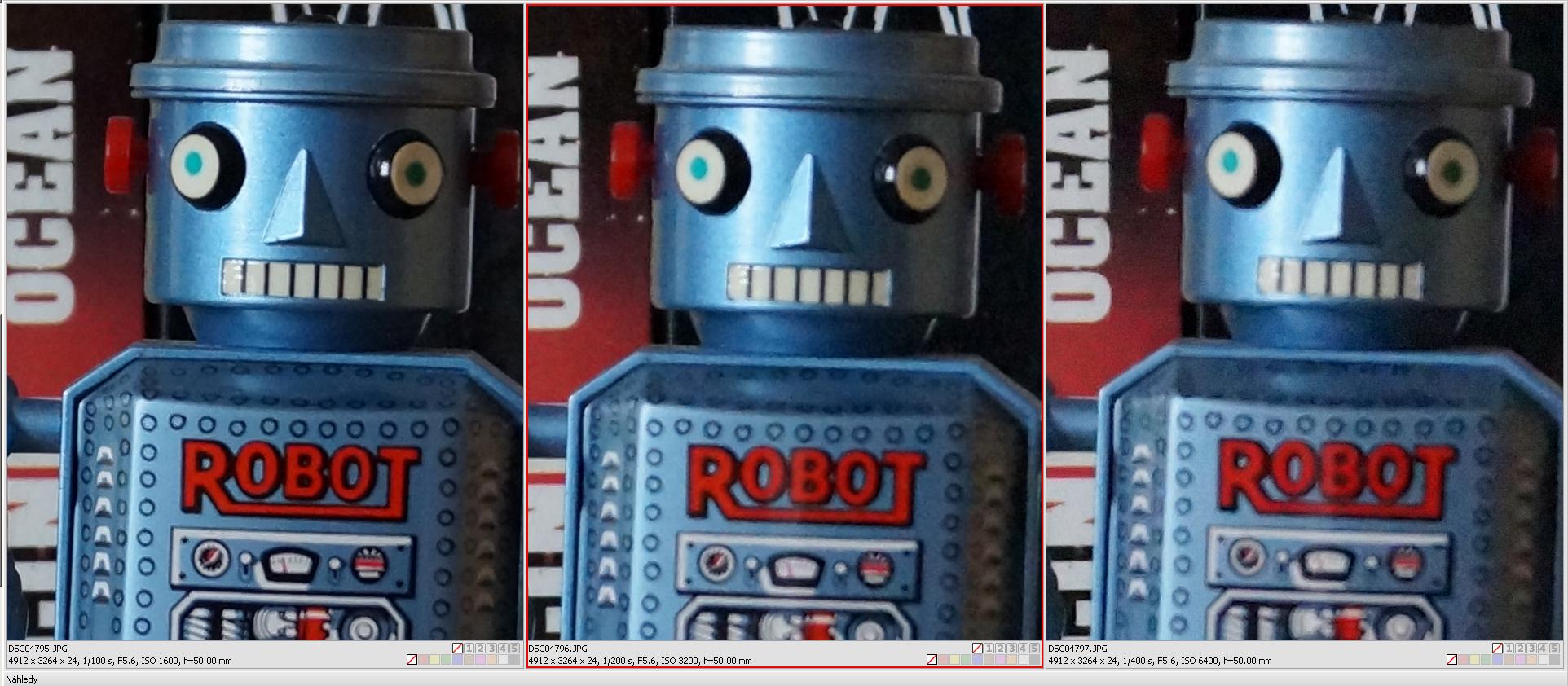 Pocitově je to plastová hrkačka, ale výkon má výborný. Skvěle se chová automatika i rozšířená automatika a myslím, že běžný uživatel a ne-milovník pátracích dobrodružství by se měl na zelený foťáček dobře spolehnout. Setový objektiv s obvyklým rozsahem 18 – 55 v pohodě slouží, zpoždění je nepatrné, takže se dá fotit i rychlý děj. Pracovat lze i s vysokým ISO a v jakž takž slušném světle se dají pořídit snesitelné obrázky i při 3200 ISO. Zde je srovnání 1600 / 3200 / 6400 ISO.
