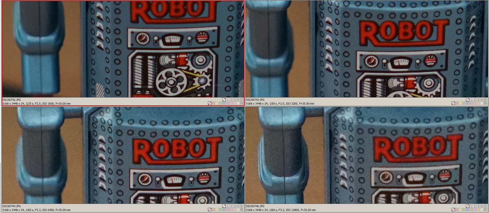 Jako vždy při testech jsem fotil v JPEG, protože pak se ukáže, co umí fotoaparát a nikoli při konverzi Camera Raw potažmo já. I pak ale nebyly žádné problémy s přepaly (slunce v záběru se nepočítá). Na další ukázce máme výřez ze snímků při 1600, 3200, 6400 a 12800 ISO. Na posledním snímku je šum vidět, ale při rozlišení 42 mega se opravdu ztratí v tlačenici (ukázky jsou při 18 Mpx).