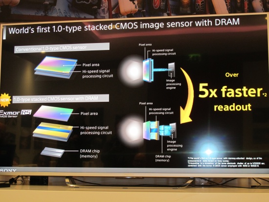 Největší atrakcí nového modelu Alpha A6300 je snímač. Jde o snímač s DRAM pamětí, takže přenos dat je podle údajů výrobce pětkrát rychlejší než co dokáže konvenční snímač. To se prověřit nedalo, jen ofotit z prezentace:
