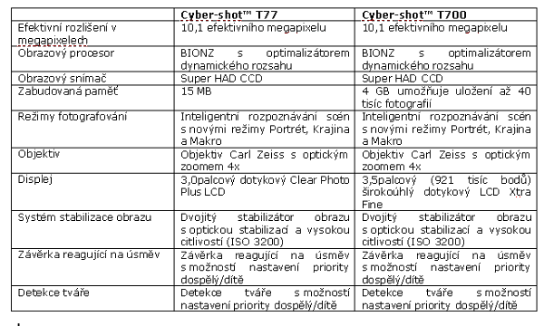 Tisková zprávy Sony Štíhlý a stylový: DSC-T77 Fotoalbum ve vaší kapse: DSC-T700 Dvě skvělé novinky v řadě fotoaparátů Cyber-shot™ T od Sony překypují neuvěřitelnými funkcemi, které vám pomohou pořizovat nádherné snímky. Tenké, barevné a snadno přenosné – stanou se dokonalými partnery pro každou příležitost, od nocí plných zábavy přes dovolené, party či rodinná setkání. Cyber-shot™ T77: nejtenčí fotoaparát na světě s 4x optickým zoomem Elegantní vzhled je dále podpořed velkým, krásným 3palcovým dotykovým LCD. Všechny funkce jsou řízeny přes dotykový displej, takže máte neustálý přehled o svých snímcích a nemusíte se zabývat malými ovládacími tlačítky, to vše v širokoúhlém formátu. Uvnitř tohoto nádherného těla je Cyber-shot™ T77 nabit chytrými technologiemi Sony, které vám pomohou pořizovat, sdílet a užívat si lépe vypadající snímky. Čistě a ostře kreslící objektiv Carl Zeiss Vario-Tessar poskytuje nedostižnou kvalitu obrazu, výkonný 4x optický zoom umožňuje pořizování snímků zblízka i z dálky. T77 je nejtenčí Cyber-shot™ v historii. Závěrka reagující na úsměv je nyní ještě snáze ovladatelná než dříve. Získáte tak jedinečnou možnost zachytit co nejvíce šťastných okamžiků. Stačí vybrat režim „Smile Shutter“ reagující na úsměv a namířit fotoaparát: Cyber-shot™ T77 automaticky pořídí snímek, jakmile se některá z fotografovaných osob v záběru usměje. Zlepšena byla i detekce tváře, která nyní umožňuje předem vybrat, zda portrétujete děti nebo dospělé. S funkcí Face Detection získáte zároveň přirozené portréty s přesným tónem pleti, expozicí a zaostřením. Zcela nová technologie prevence mrknutí omezuje riziko, že portrét přátel či rodiny zkazí něčí mrknutí. Portrétní režim pořídí rychle za sebou dva snímky a automaticky vyřadí ten, na kterých mají portrétované osoby zavřené oči. Dále bylo zlepšeno inteligentní rozpoznávání scén. Nyní budou automaticky upravena nastavení v ještě širším rozsahu běžných fotografických situací, jako jsou portréty, krajiny a makro snímky z blízka. Výkonný procesor BIONZ a vysoká citlivost (maximálně ISO 3200) jsou doplněny technologií Clear RAW Noise Reduction pro zachování nádherně přirozených výsledků i při fotografování v místnostech nebo při soumraku, bez použití blesku. Optimalizátor dynamického rozsahu (DRO) zajišťuje lepší vyvážení nejjasnějších světel a nejtmavších stínů. Hodí se k pořizování snímků v obtížných podmínkách, například při portrétování proti slunci. Po fotografování můžete své vzpomínky oživit formou slideshow s hudbou. Pokud chcete ještě větší obraz, stačí T77 připojit k HD televizoru a v obývacím pokoji se nebudete stačit divit. Cyber-shot™ T700: fotoalbum ve vaší kapse Podobně jako Cyber-shot™ T77 je i T700 nabízen v pěti aktuálních barvách. Dle svého stylu si můžete vybrat mezi černou, stříbrnou, zlatou, růžovou nebo červenou. Na zadní straně fotoaparátu nejsou žádná tlačítka – jen 3,5palcový širokoúhlý displej Xtra Fine LCD. Velký dotykový displej dokáže fotorealisticky zobrazit vaše snímky a prohlížení vaší fotosbírky i nastavování fotoaparátu je skutečně hračkou. T700 je chytřejší než běžné fotoalbum. Všechny snímky jsou uloženy v šikovných složkách, takže se ve svých vzpomínkách neztratíte a potřebný záběr najdete téměř ihned. Pokud jste na dovolené nebo služební cestě, fotoaparát ukládá datum a čas pořízení snímku a automaticky je indexuje pro snadné vyhledání. Režim fotoalba organizuje snímky do složek tak, že jsou zvlášť miminka, děti i dospělí – dokonce můžete mít odděleně i snímky s úsměvy. Výběr snímků a jejich nahrání na osobní fotoblog nebo web pro sdílení snímků už nemohou být jednodušší. Fotoaparát Cyber-Shot lze také synchronizovat s PC. Funkce Easy Exporter v režimu Picture Motion Browser po jediném stisku tlačítka přenese snímky v plném rozlišení na počítač a menší kopie uloží zpět do fotoaparátu Cyber-shot, takže si přímo ve fotoaparátu můžete na cestách zobrazit tisíce fotografií. Původní data v plném rozlišení zůstávají na PC. Podobně jako T77 i Cyber-shot™ T700 využívá vylepšenou funkci „Smile Shutter“ – automatickou detekci úsměvu, vylepšenou detekci tváře, technologii prevence mrknutí a propracované inteligentní rozpoznávání scén. Cyber-shot™ T77 a T700 budou k dispozici od října 2008.