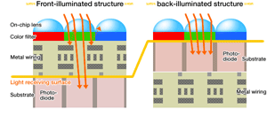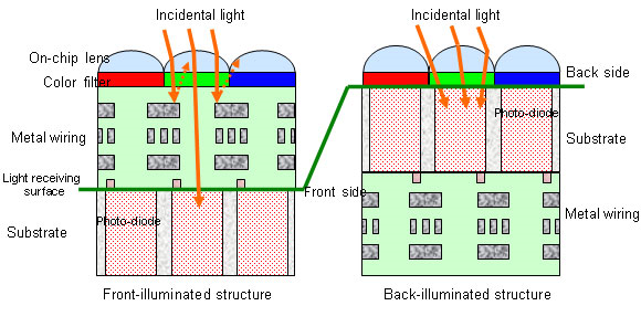 Společné mají sběrné čočky (světlemodré kopulky nahoře), pak následují filtry – červený, zelený a modrý, nezbytné k získán í barevné informace pro kanály RGB. V tradičním senzoru následují vodiče – uvádí se, že zakrývají až 3/4 plochy aktivní vrstvy, tedy plochy fotodiody: to je ono místo, kde se energie světla mění v elektrický náboj, kde fotony vyrážejí z valenčních sfér elektrony. Na schematu vidíme vlevo, že vodiče stíní a navíc odrážejí světlo, kdežto vpravo světelné paprsky bezprostředně vnikají do aktivní vrstvy. Na následujícím animovaném gifu je znázorněno, jak paprsky pronikají do struktury, generují elektrony a ty pak odcházejí do vodiče a jeho prostřednictvím – to ovšem na animaci už není – do analog.digitálního převodníku k dalšímu zpracování.
