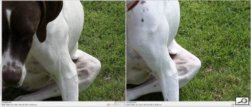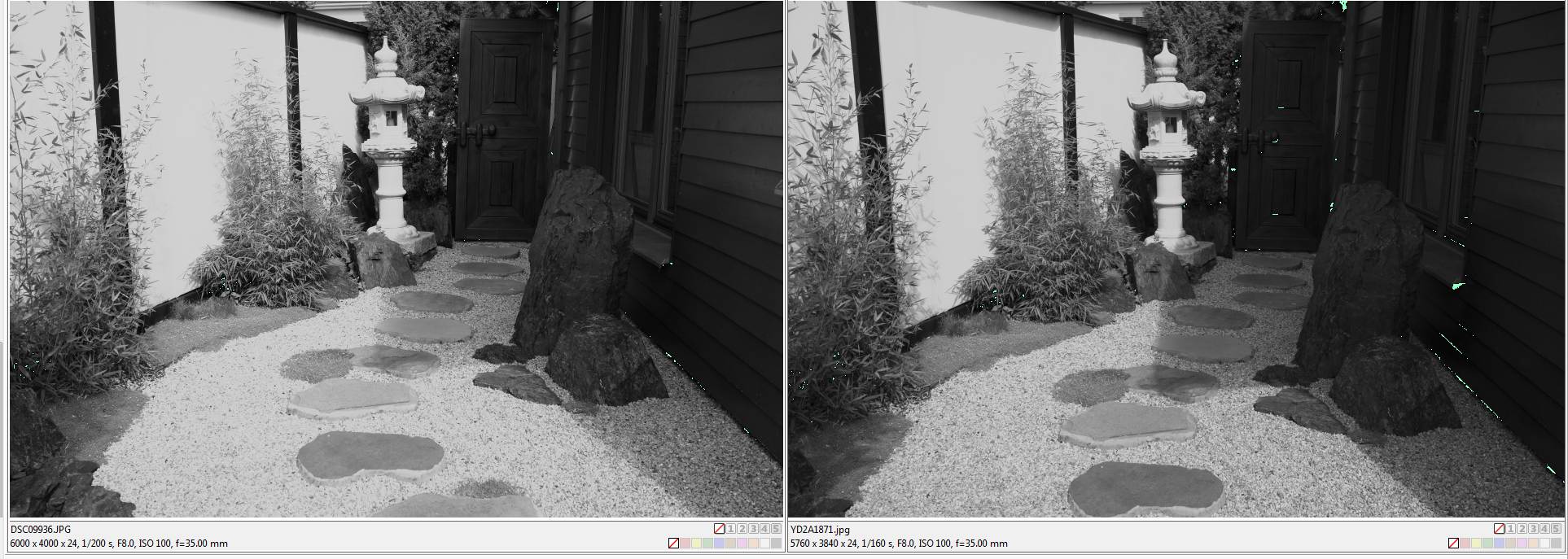 Dynamický rozsah držely oba více méně stejně, všechna čest oběma – zde bílá zeď a tmavé kameny ve stínu za slunečného dne a nejsou tam přepaly, jen nepatrné slitiny stínů: