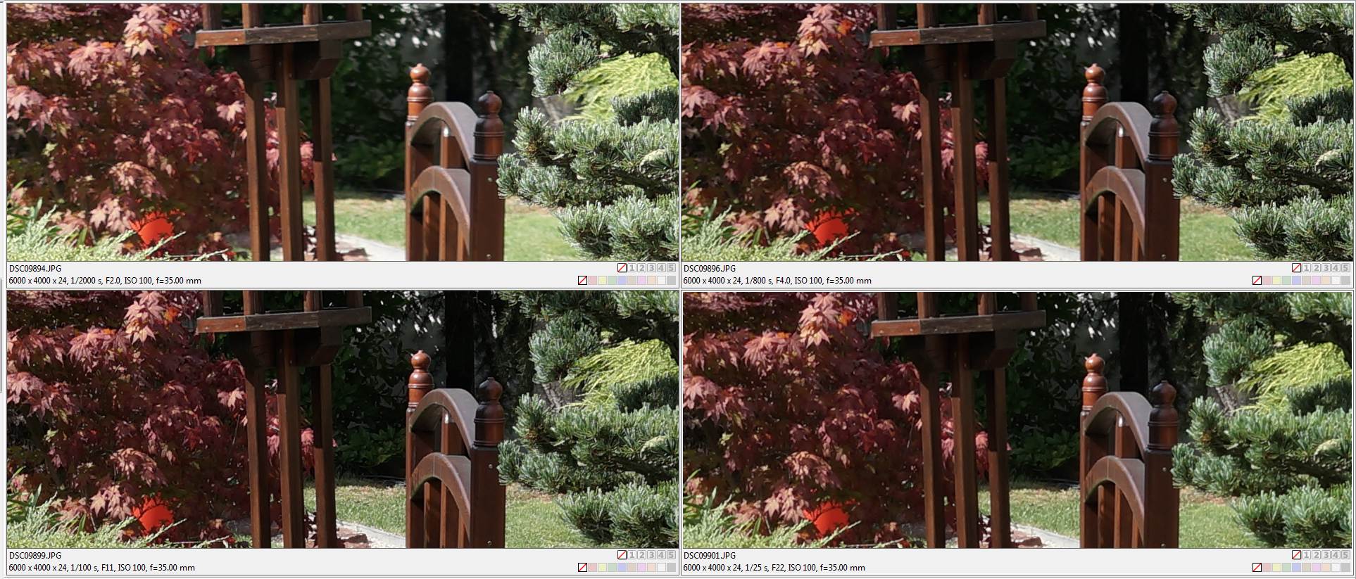 Kresba je stabilní od plné světelnosti k nejvyšší cloně F22 -zde jsou kroky F 2.0, 4.0, 11 a 22.