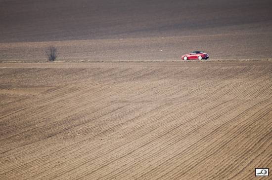 Jaromír Kačer nazval svoji fotografii Červená: monochromatickou krajinu oživuje spěchající červené autíčko. Graficky čistá fotografie – také ona by mohla být v příručce o kompozici – linie silnice vede po horní třetině a autíčko je na průsečíku s pravou svislou třetinou. Čtvrté místo.