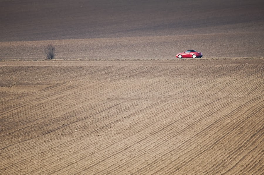 Jaromír Kačer nazval svoji fotografii Červená: monochromatickou krajinu oživuje spěchající červené autíčko. Graficky čistá fotografie – také ona by mohla být v příručce o kompozici – linie silnice vede po horní třetině a autíčko je na průsečíku s pravou svislou třetinou. Čtvrté místo.