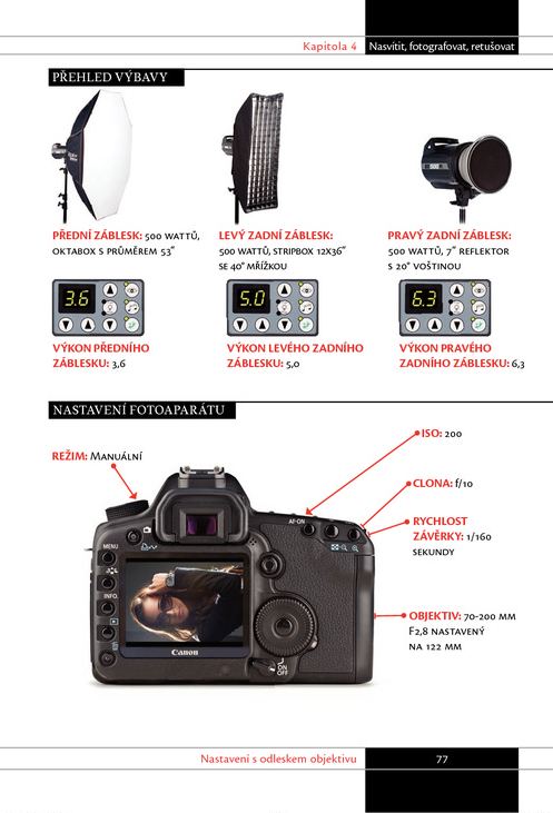 Kelby je chytrý obchodník a nedopouští se mnoha chyb… takže velmi rozumně oslovil obě rivalské skupiny, canonisty i nikonisty. Vysvětluje v každé kapitole, jak se to či ono nastaví na Nikonu a jak na Canonu a jen jaksi bokem utrousí, že sám ty fotky fotil Nikonem. Na této ukázce (převzal jsem ze stránky Neoluxoru, tam ji prodávají za 359 Kč) prezentuje nastavení blesků a fotoaparátu, tentokrát Canonu.