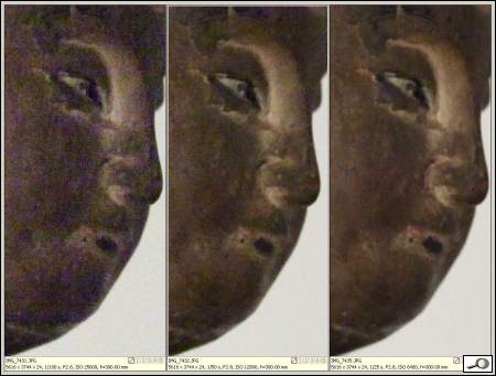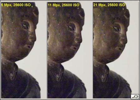 Tak především: je třeba předeslat, že některé kompakty nabízejí vysoké ISO (na př. 3200) za cenu snížení rozlišení na 25%. Navíc pak dochází k redukci šumu a výsledkem jsou rozmydlené obrázky, sice bez velkého šumu, ale taky bez kresby. To nemám na mysli. Zkušební série, kterou jsem pořídil, zahrnuje rozlišení 21 Mpx, 11 Mpx a 5,2 Mpx zrcadlovky Canon EOS 5D Mark II. Snímky byly pořízeny ze stativu při velmi slabém světle objektivem Canon 300 mm / F2,8. Při zobrazení na monitoru subjektivně je šum skutečně nejméně vidět na snímku 5,2 Mpx a nejvíce při 21 Mpx. Ovšem kresebně vychází snímek 5,2 Mpx nejhůř z oněch tří.