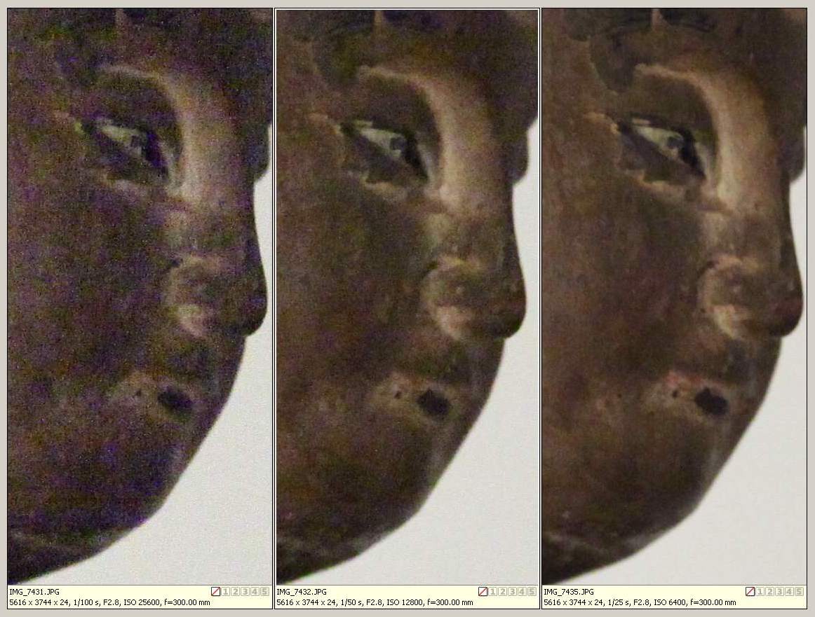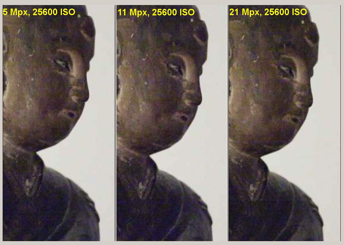 Tak především: je třeba předeslat, že některé kompakty nabízejí vysoké ISO (na př. 3200) za cenu snížení rozlišení na 25%. Navíc pak dochází k redukci šumu a výsledkem jsou rozmydlené obrázky, sice bez velkého šumu, ale taky bez kresby. To nemám na mysli. Zkušební série, kterou jsem pořídil, zahrnuje rozlišení 21 Mpx, 11 Mpx a 5,2 Mpx zrcadlovky Canon EOS 5D Mark II. Snímky byly pořízeny ze stativu při velmi slabém světle objektivem Canon 300 mm / F2,8. Při zobrazení na monitoru subjektivně je šum skutečně nejméně vidět na snímku 5,2 Mpx a nejvíce při 21 Mpx. Ovšem kresebně vychází snímek 5,2 Mpx nejhůř z oněch tří.