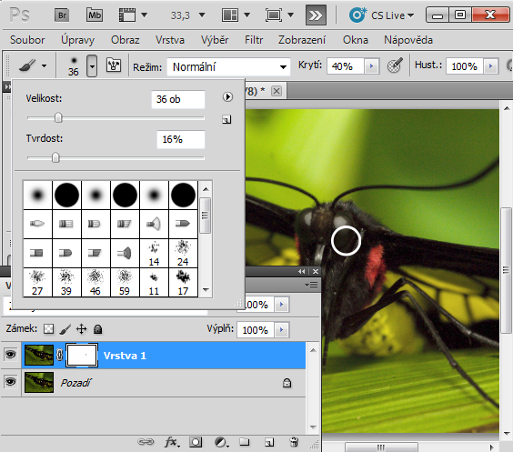 Opakuji, nejde nám teď o šum, nemáme zdrojový obrázek, zabýváme se teď elementární úpravou ve vrstvách, nic jiného neřešíme. Obrázek je bezesporu jasnější. Ale chtěli bychom mu dát nějakou náladu, zvýraznit ho, přidat mu plastičnost. Opět, je mnoho cest jak to dělat. Dobré je nyní pracovat s maskou, protože i toto je neinvazivní úprava a mohu ji korigovat, mohu se vracet, měnit rozhodnutí, aniž bych obrázek jakkoli narušil. Maska je součástí pracovního prostoru Photoshopu a dokud vše neuložím jako jednovrstevný obrázek, kupříkladu JPG, mohu se k práci vrátit a dále ji rozvíjet. Takže tedy masky. Bílá maska odkrývá, tedy to co je teď světlé ukazuje jako světlé. Když ale budeme po takto bíle vymaskované vrstvě malovat černou barvou, výsledek je, jako bychom gumovali a dostali se dolů na tu tmavou fotku. Na ukázce je vidět že jsme nasadili masku (bílý obdélník ve vrstvě 1) a teď vybíráme velikost a míru rozpití štětce, jímž budeme po masce malovat. Kurzor štětce je znázorněn bílým kolečkem. Opakuji, je to jakoby guma , kterou se progumujeme dolů na tu tmavou fotku. Když usoudíme, že jsme gumovali moc nebo vedle nebo špatně, přepneme černou barvu na bílou a to progumované zase zalepíme – můžeme se takto zmýlit a napravovat do soudného dne a otce se nic nestane.