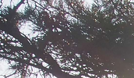 Toto je aberace – výřez 100% z fotky, kdy se fotilo proti jasnému nebi a slunce bylo v záběru.