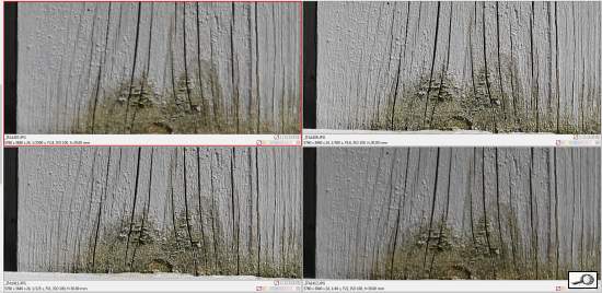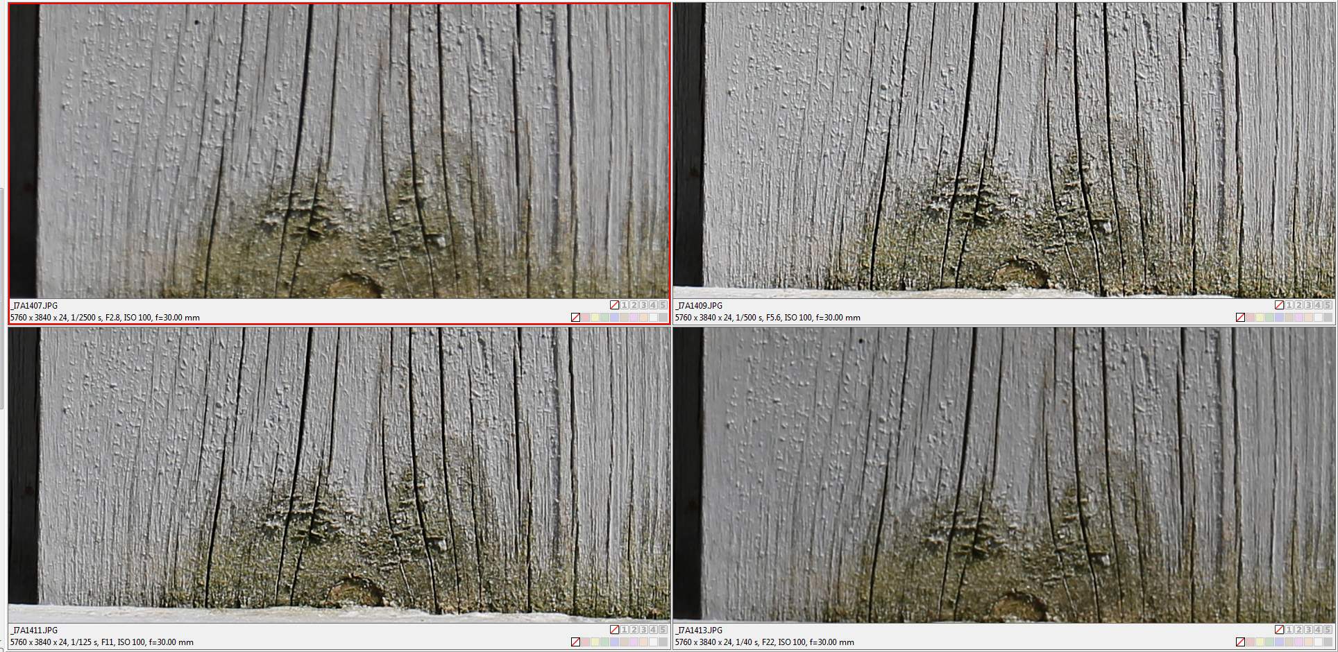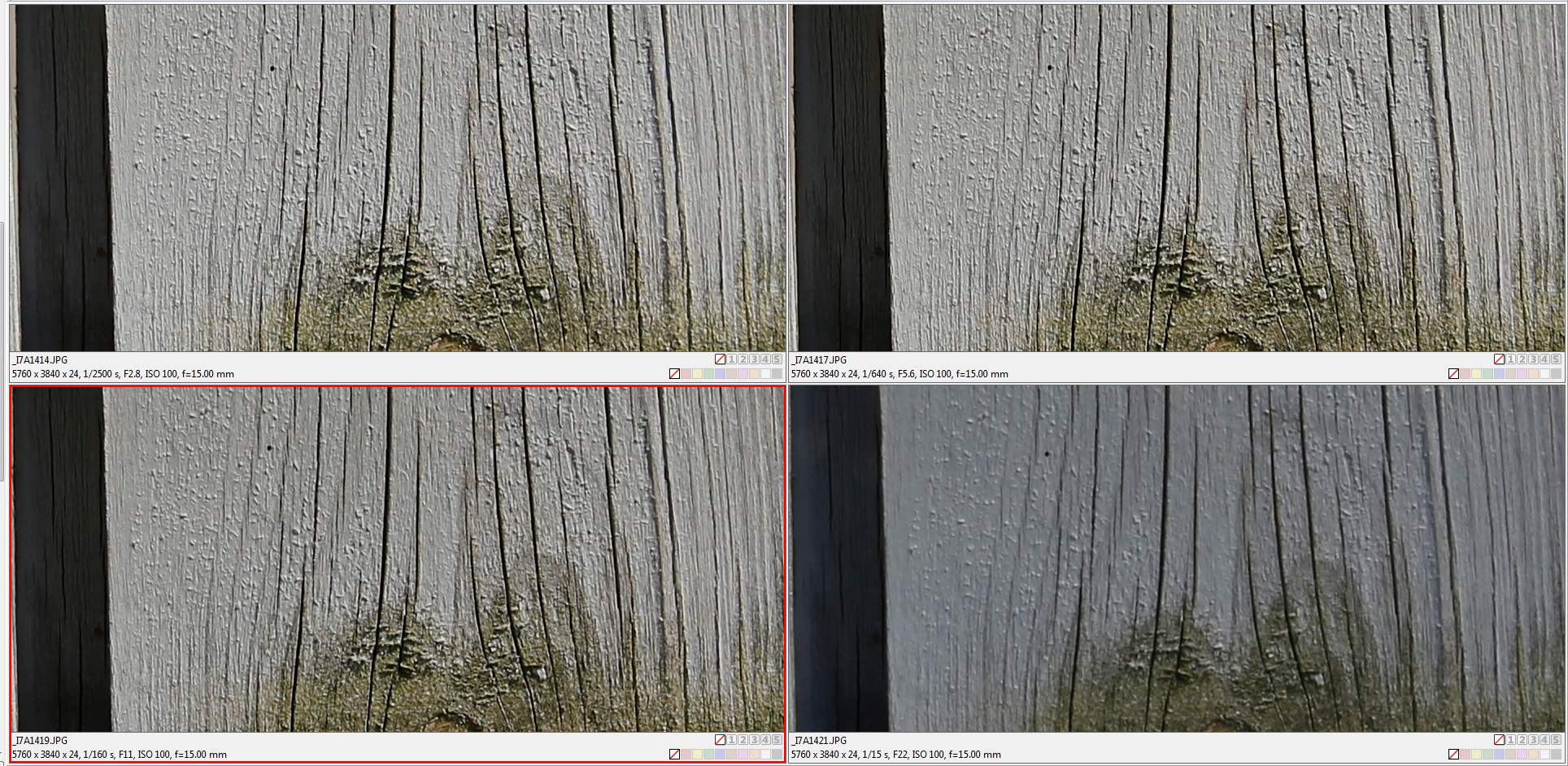 Kresba je v podstatě bezproblémová už od plné světelnosti F2.8, jak při ohnisku 15, tak 30 mm. Znatelně zeslábne při F16 a hodně slabá je při F22, ale to je normální důsledek ohybu světelných vln přes hrany clony (difrakce). Zde je 100% zvětšení při 15 mm, clony 2.8, 5.6, 11 a 22.