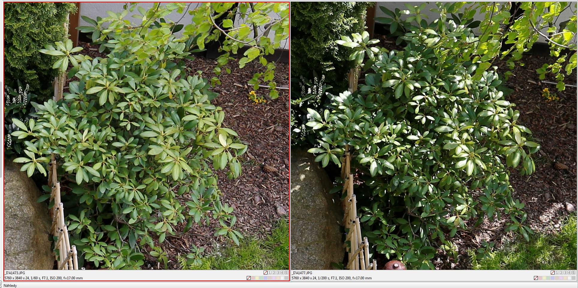 Stabilizace samozřejmě funguje, dělal jsem obvyklý test 10 fotek po sobě. Zastávám názor, že jakž takž bezpečná je rychlost závěrky blízká aspoň dvojnásobku numerické hodnoty ohniska, tedy při 15 mm by to měla být 1/30 sec, pokud se fotí na full frame s vysokým rozlišením (zde 24 mega). Takže: při zapnuté stabilizaci byly všechny snímky pořízení při bezpečné 1/40 sec ostré jak při zapnuté, tak při vypnuté stabilizaci. Při 1/20 sec byl neostrý jeden, ostatní v podstatě ostré stejně jako předchozí série. Při 1/8 sec byly s přimhouřením oka jakž takž použitelné 2 z 10.