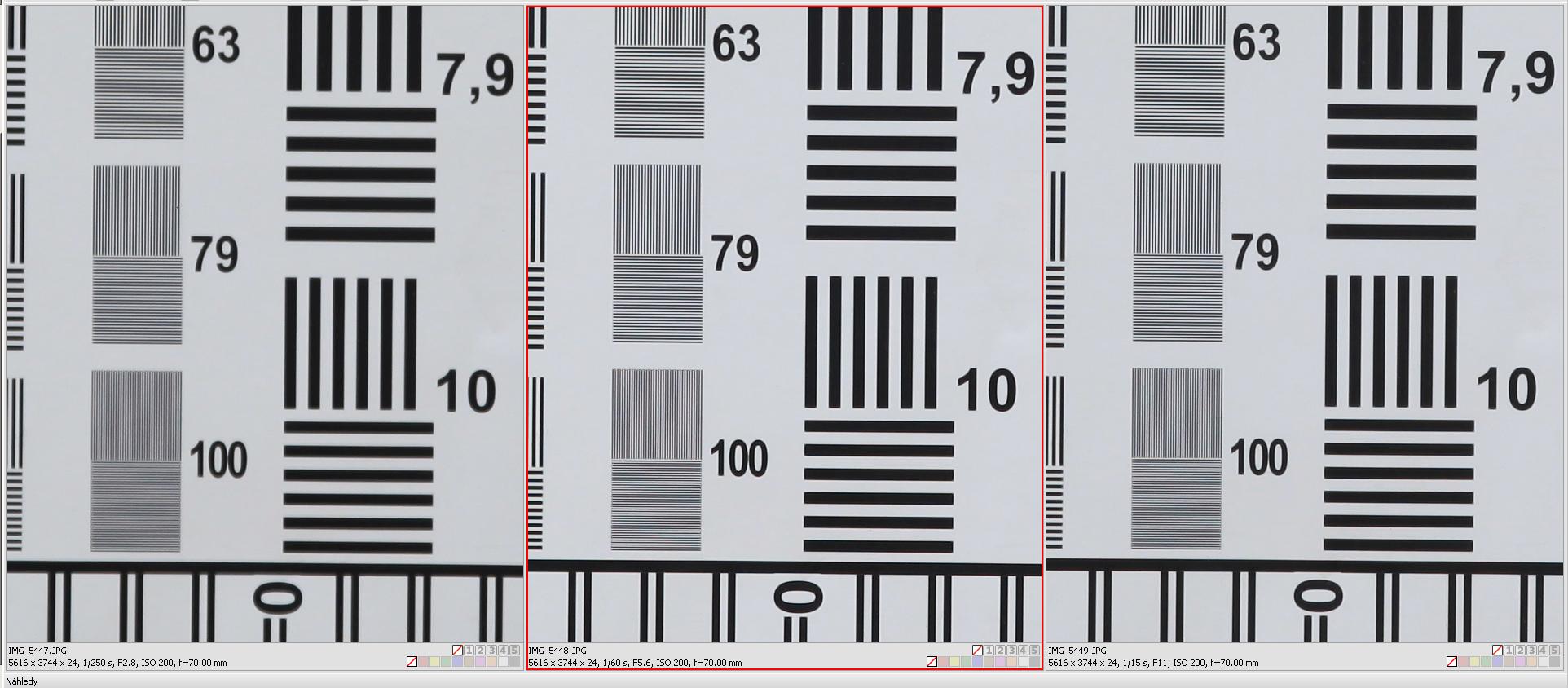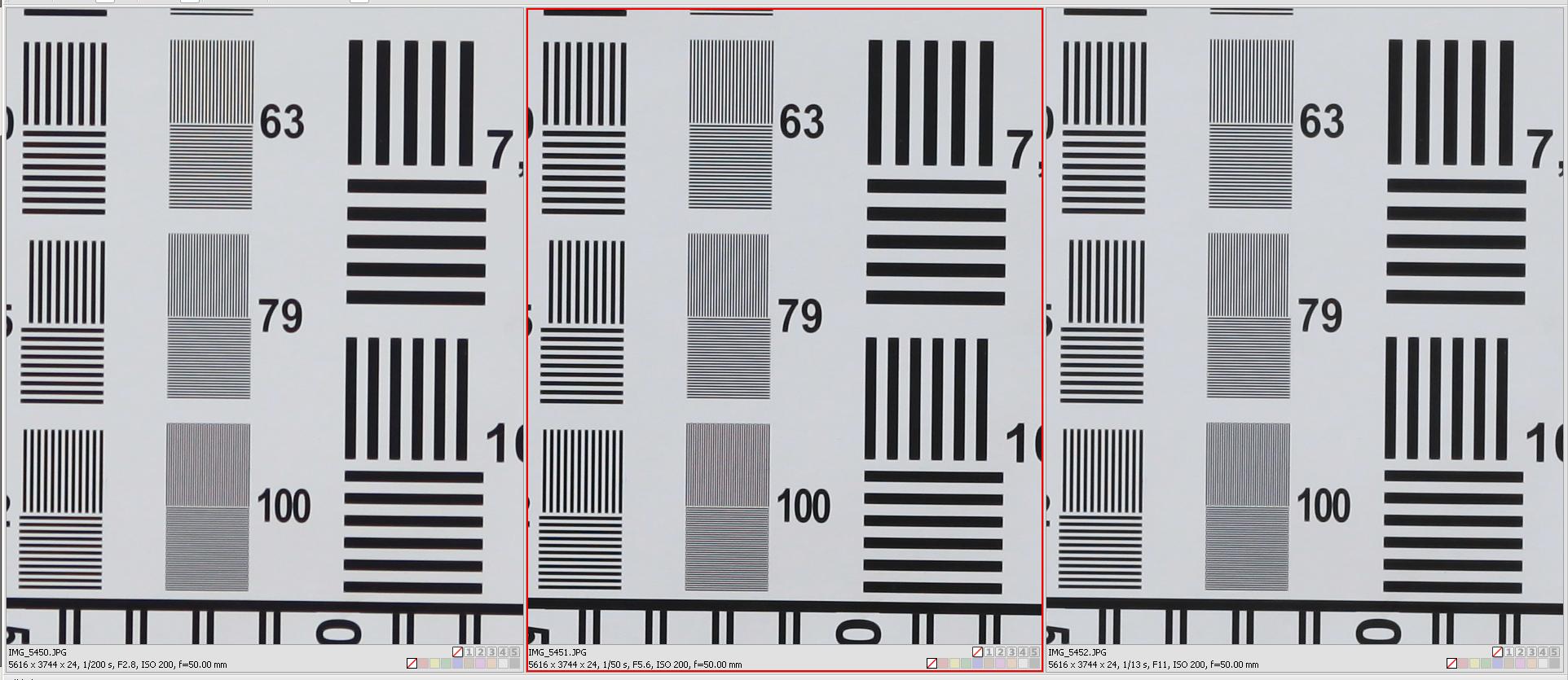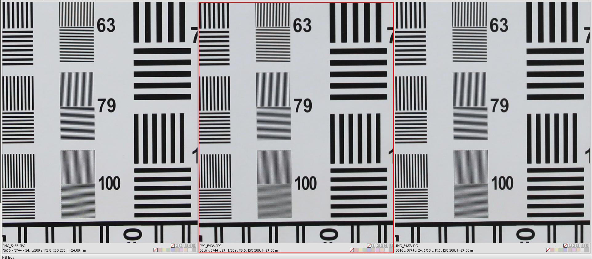S prodloužení ohniska kresba mírně klesá a projevuje se mírné barevné moaré – což samozřejmě bude individuální podle použitého fotoaparátu, zde je to Canon 5D Mr II. První trojice je při ohnisku 50 mm: