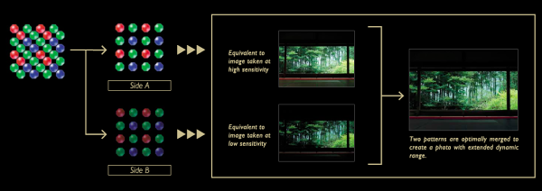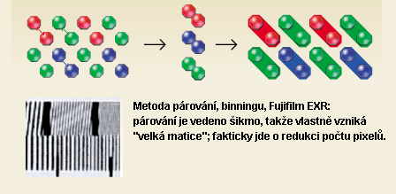 V roce 2003 byl představen Super CCD SR s dvěma fotodiodami na buňku, jak je patrný z obrázku zde vpravo. Na obrázku je dobře vidět voštinové uspořádání buněk – oproti tradičnímu, které je pravoúhlé (jako na př. šachovnice). ![]() Vlevo je tradiční uspořádání: střídají se filtry červený, zelený a modrý. Jsou ve čtvercích, přičemž zelených je dvakrát víc než červených a než modrých – bylo to stanoveno takto proto, že lidské oko vnímá nejvíce zelených odstínů. Vlevo je uspořádání čipu EXR. Zelených filtrů je opět dvojnásobek, avšak všechny jsou zdvojené. Z toho logicky plyne, že dvě sousední fotodiody kryté stejně barevným filtrem získají prakticky totožný náboj. Jelikož mají totožný zisk světla, eventuální rozdíl v náboji musí být šum a ten se tudíž relativně snadno odstraní, odečte. Už dlouho se používá tzv. binning, tedy zdvojování pixelů: mnoho přístrojů nabízí vysoké ISO, avšak při menším rozlišení. Zde je schema, jak ho zveřejnil Fujifilm: ![]() Nový způsob binningu, umožněný jiným rozložením filtrů, vypadá takto – opět materiál Fujifilmu: ![]() Na jiném schematu to Fujifilm vysvětluje takto: ![]() UI zde je pěkně vidět, že “jednotlivých pixelů” je polovička, ale jsou větší, tudíž “spojenými silami” zpracovávají efektivněji světlo. Dva malé pixely “bok po boku” fungují jako jeden velký. Automatika přístroje je tedy schopna přepnout z jednoho módu na druhý. Přirozeně, bude třeba si vše prověřit v praxi. Fujifilm v minulosti měl někdy konflikty s odbornou veřejností kvůli reálným počtům pixelů (jako dnes Foveon). Podle logiky tohoto schematu “vysoce citlivý” režim redukuje 12megový CCD na 6 megový. Ne snad, že bych proti 6 Mpx něco měl! Lépe 6 Mpx s vysokým ISO bez velkého šumu, než zašuměné 12 Mpx. Ale jak říkám, uvidíme, jak se bude přístroj chovat. Dynamický rozsah ![]() Ze schematu vyplývá, že jsou pořízeny dva dílčí snímky (jako při metodě HDR), jeden s vyšší, druhý s nižší citlivostí a z těch dvou pak vznikne jeden složený (fakticky HDR) snímek. Není mi ale jasné, jak se dosáhne té vyšší a nižší citlivosti, zdali vyšší s binningem (tedy 6 mpx) a nižší bez (12 Mpx? Ale jak by pak vznikl HDR? Interpolací 6 Mpx na 12 Mpx?). Toto jsou nejasnosti a věřme, že budoucnost přinese odpověď. Každopádně je třeba vítat každou inovaci vedoucí k vyšší citlivosti a většímu dynamickému rozsahu, jakož i redukci šumu bez omezení kresby. Nový přístroj tedy budeme s napětím očekávat. |