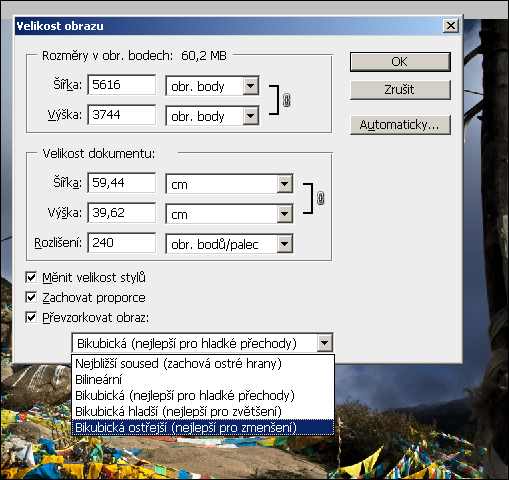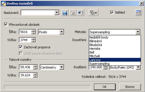Tiskové rozměry – to znamená, jak velý obrázek (zde šíře 59,463 cm) získáme při DPI 240. O to se nemusím starat, pokud nechceme tisknout a nerozumíme tiskárně. Důležitá je ale metoda: Na téhle ukázce je výchozí Lanczos a změna na Supersampling. No, vyzkoušel jsem všechny, nejhorší je “nejbližší body”, někdy jsem vyznavač Lanczose, jindy supersamplingu, velké rozdíly v tom nejsou.