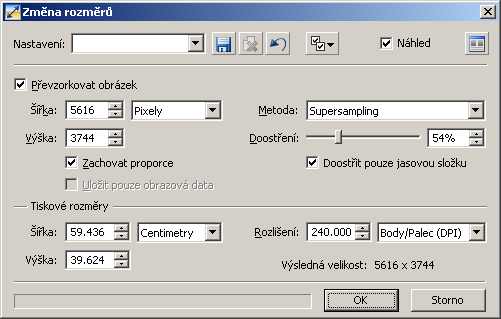 V té první ukázce jsem rozbalením nabídky “metody” zakryl to důležité, co je vidět teď, totiž doostření. V tom je totiž jádro pudla. Při zmenšení se obrázek rozmaže, ale my mu můžeme nastavit softwarové doostření a to se dělá právě zde. Na ukázce mám nastaveno 54%. Hodnota kolem 50 se mi osvědčila a jestli je to 54 nebo 48, z toho se nestřílí.