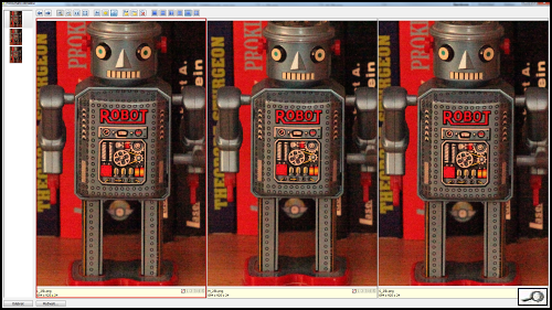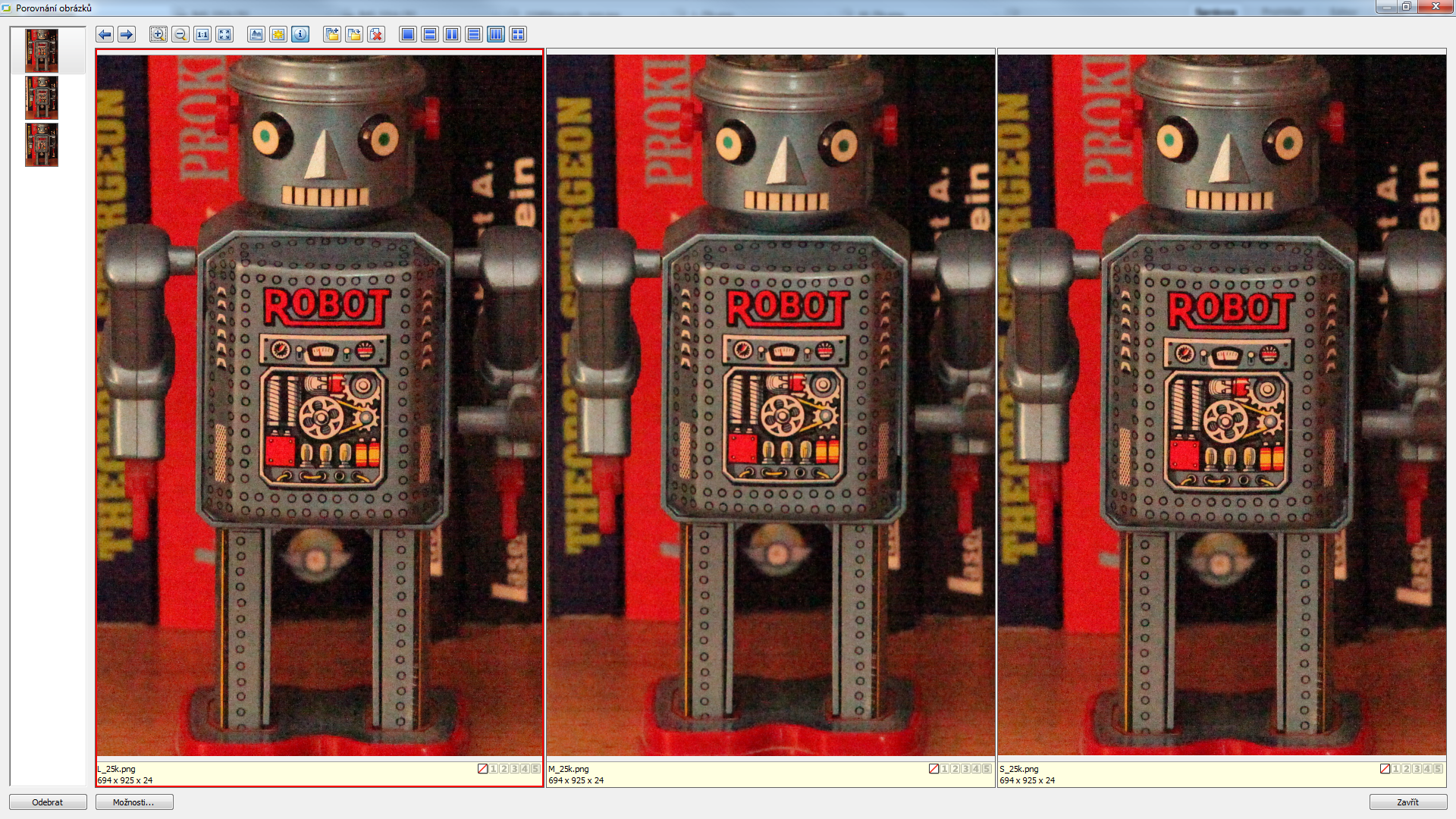 Fotil jsem tedy při této maximální citlivost, a postupně snižoval rozlišení: 21 megapixelů, 11 Mpx a 5 Mpx. Expozice byla ve všech třech případech stejná. Pak jsem na monitoru postupně zvětšoval obrázek tak, abych dostal figurku do plného formátu. Počínal jsem si tedy stejně, jako kdybych tiskl ty fotky na daný formát. Podotýkám, že jsem tento pokus už dělal – a výsledné obrázky A4 byly od sebe k nerozeznání, nikdo nepoznal, který je z 21, 11 a 5 Mpx. Teď se ale zabýváme šumem. Udělal jsem si screenshoty, tedy záznamy obrazu z monitoru, abych měl všechny tři stejně velké opět, je to totéž, jako bych to tiskl. No a všechny tři srovnal: