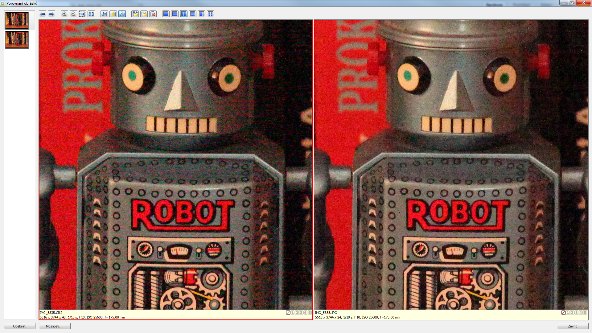 Obrázek označený cr2 je mnohem víc poznamenaný šumem, zejména barevným. Ale pozor, nepodléhejme dojmům. To vlevo, co jsem spatřil v prohlížeči Photo Studia Zoneru, není raw, je to náhled rawového obrázku! Takže když někdo tenhle obrázek uloží “ulož jako JPEG”, získá velmi bídnou kvalitu. Takže znovu, nejdřív musí proběhnout konverze: