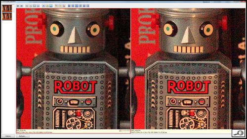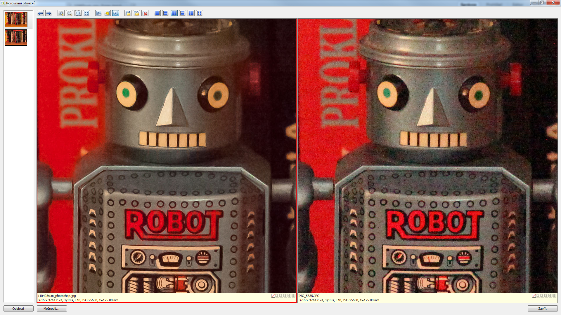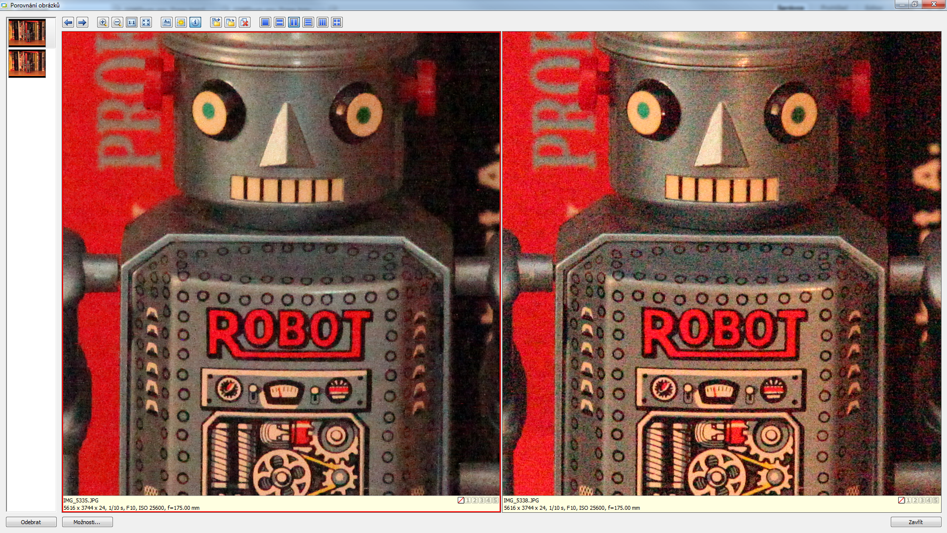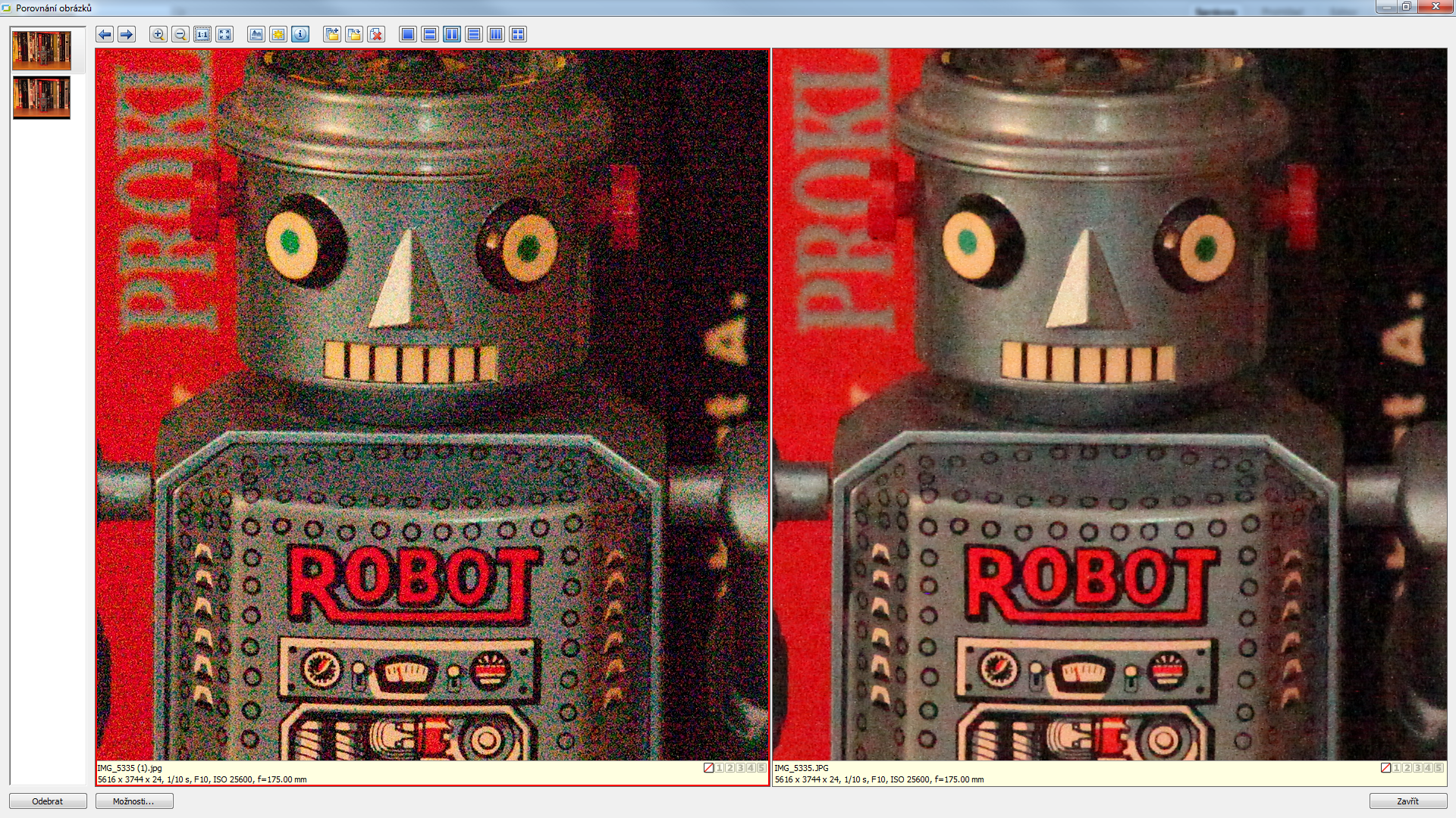 Kutálejte mě ze schodů, jestli vidím zásadní rozdíl. Pravda, každý obrázek má ten šum trochu jiný, ovšem to je dáno tím, že šum je proměnný jev – kdyby nebyl, jak snadné by bylo ho odstranit! Ale když už jsme v tom srovnávání, pokračujme. Já ty fotky fotil souběžně v JPG a RAW. A zde – na první pohled – je rozdíl značný:
