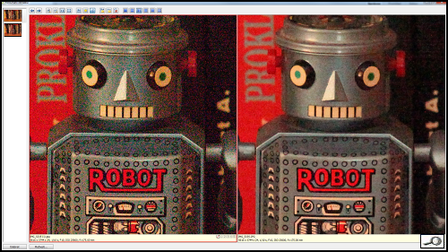 Jak je to všechno možné? Vysvětlení prosté. RAW jsou syrová data, nasbíraná i s šumem, a ten se odstraňuje až při konverzi – záleží na tom, jak to který konvertor umí. Camera Raw, jak vidno, to umí moc dobře. Nezbude tedy než udělat ještě jeden pokus. Zatím bylo to srovnání trochu nefér. RAW zaznamenává i šum, kdežto při generování JPEG je nastavena redukce šumu, přímo ve foťáku. V Mark II jsou tři stupně, nízká, standardní a vysoká redukce. Defaultně je nastavena standardní redukce, a takto byly redukovány naše dosavadní ukázky JPEG. V uživatelských nastaveních Canonu 5D tedy redukci šumu při vysokém ISO vypneme. Na ukázce je tentokrát vlevo JPEG se standardní redukcí a vpravo bez redukce. Rozdíl je značný: