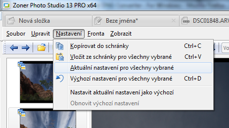 ![]() Každý lze upravovat extra, ale také lze na všechny vybrané aplikovat tu úpravu, kterou jsme si odladili na jednom z nich. To je důležité. Když je všech pět vybraných v podstatě stejných, je to veliká výhoda. Když je po všech úpravách, postupujeme takto: 1) klepneme na položku fronta nahoře na liště: ![]() 2) teď řekneme konvertoru, jak má s fotkami ve frontě naložit. Klepneme na nastavení: ![]() Od zítra editujeme naostro. ![]() |