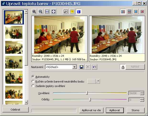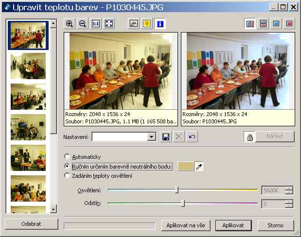 Postupujeme metodou “pokus – omyl” – kapátkem klepeme na různá místa na stěně za sedícími osobami, dokud nedosáhneme uspokojivého výsledku. Výsledek každého pokusu sledujeme na obrázku vpravo. Jakmile jsme spokojeni, stojíme před poslední volbou. Dole lze výsledek buď stornovat, nebo aplikovat na všechny obrázky (volba aplikovat na vše) v nabídce vlevo (to jsou ty malinké náhledy nad sebou), anebo můžeme jít po jednom volbou aplikovat s možnou korekcí výsledku. V našem případě to asi nemá smysl, proto budeme aplikovat na vše a sjedeme všechny najednou.