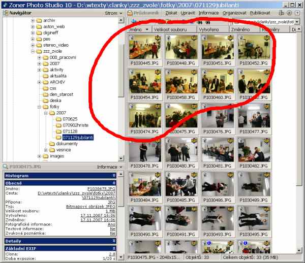 Je to v podstatě jednoduchá věc, ale potýkáme se s tím pořád. Takže dnes to bude příklad ze života – hromadná úprava teploty barev. Stane se, že dostanete od někoho balík fotek k vystavení na webové stránce. Půlka je špatně barevně vyvážená. Co s tím? Tady to vidíte, jak taková kolekce vypadá v Průzkumníku. To co je zatrženo červeně je špatně nastaveno, pak už fotograf chybu napravil a další obrázky jsou v pořádku. Byla by pěkná otrava upravovat jednu po druhé!