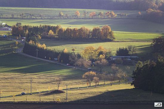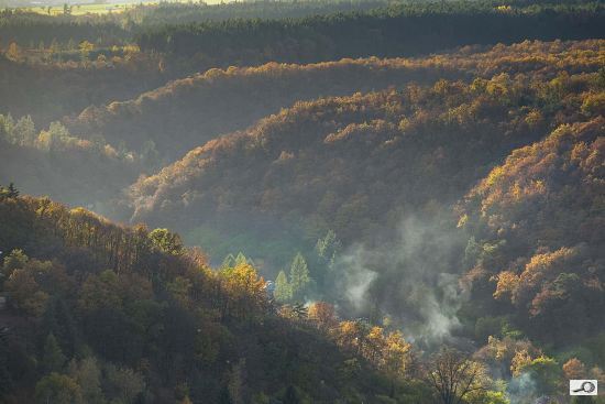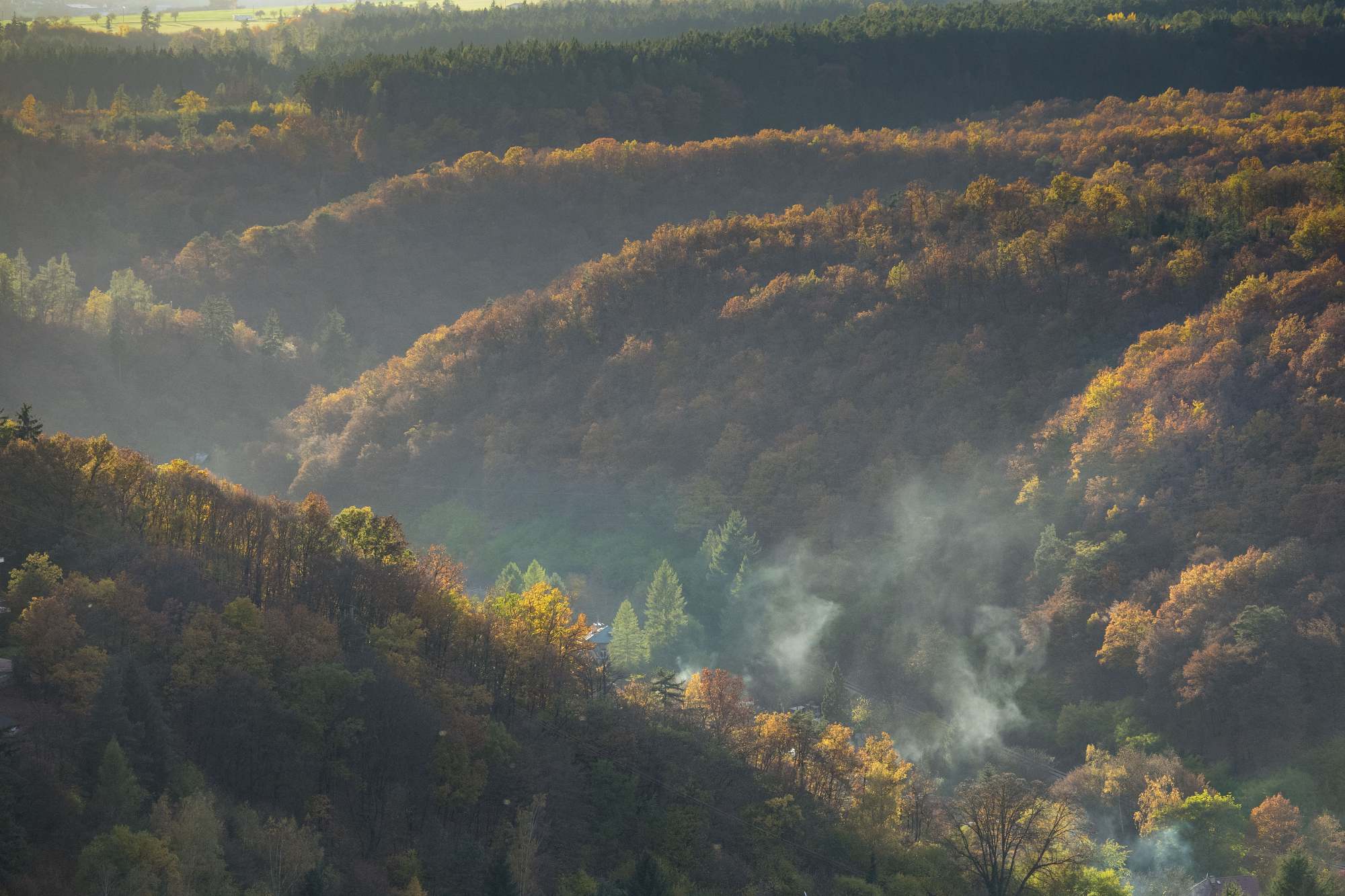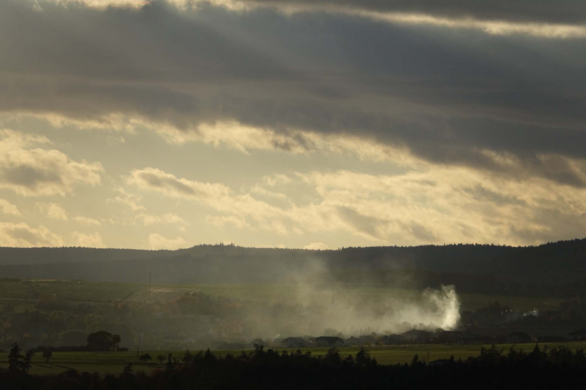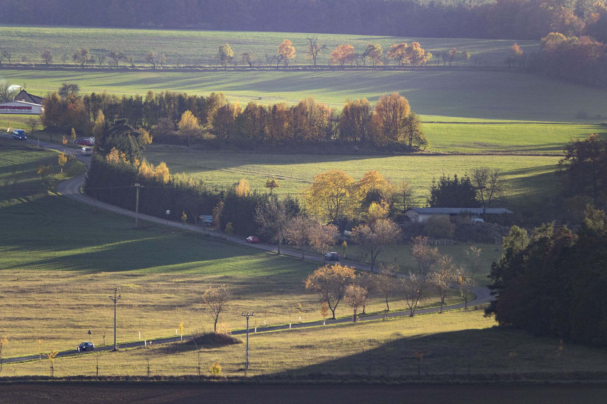 Těch 600 mm ekv. je ošemetná věc. Nemůžete od toho čekat absolutní ostrost. Ale když takhle jdu v Olešku na vyhlídku nad Vltavou, vidíte tím dlouhým ohniskem krajinu úplně jinak. Aha, támhle si koledují o soudružskou návštěvu, čím že topí v kamnech, ale návštěva nepřijde, protože petflaškama topí všichni.