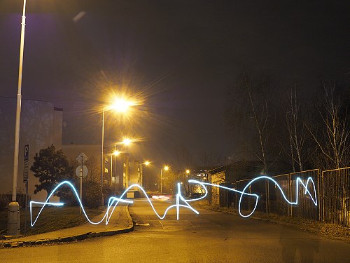 Třetí režim Olympusu je Live Comp, to znamená „composite“ neboli složený. Nejdříve exponujeme výchozí obrázek a na něj pak Olympus nanáší světlejší prvky. Takže takto jsem namaloval ve vzduchu aplikací Baterka svým iPhonem nápis Aaron: je vidět jen světelná stopa, já tam jsem vidět jen nepatrně, duchovitě.