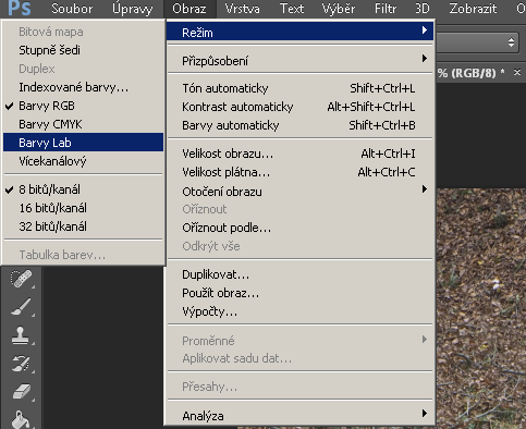 Nejdřív musíme změnit barevný prostor. V Photoshopu (pozor: nedovedou do PS Elements!!, musí to být opravdový Photoshop) otevřeme roletové menu Obraz – Režim – Barvy Lab