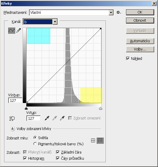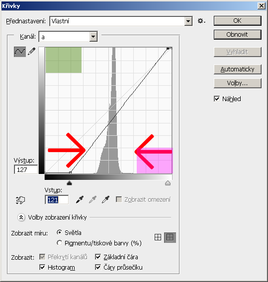 Další postup je velmi jednoduchý. Otevřeme křivky (nejlíp je pamatovat si zkratku Ctrl+M, ale lze to najít pod Přizpůsobením v menu) a postupně upravíme kanál a a poté kanál b.
