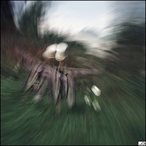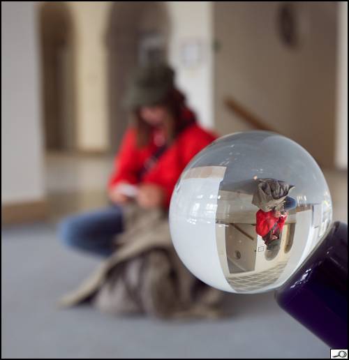 Kulička je umístěná do pravého dolního silného obrazového bodu. Roli hraje barva – červená bunda upoutá pozornost. Zde nevadí, že většina plochy obrazu je mimo ostrost, naopak, soustřeďuje to pozornost na děj uvnitř koule. Postava je pečlivě začleněná do průčelí budovy za ní. Pokud mám nějakou pochybnost, pak je to činnost té osoby. Drží v ruce nějaký papírek a zřejmě si čte. Je to trochu nepochopitelné – vypadá to jako mimoděk zachycený momentní snímek a jistě to tak nebylo, aranžmá asi bylo pečlivé. Proč si postava čte? Možná ale, že i tato záhada přispívá ke kouzlu fotky. Další dvě fotky mají jednu autorku, Zuzku Vitvarovou. Opilý strašák, jak se zdá, vznikl škubnutím fotoaparátu. Ale ono to tak jednoduché určitě nebylo…