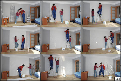 Efektní je i závěrečná fotka dnešní série. Martin Tulka ho nazval Pat a Mat aneb Domácí tapetování. A zase – nápad, příběh, příprava a realizace dokonalá po všech stránkách.