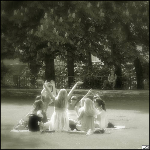 Do rodiny fotek vymyšlených a posléze realizovaných patří i tenhle „výjev ze života víl“. Znuděný chlapík v pozadí dává výjevu ironický podtext.