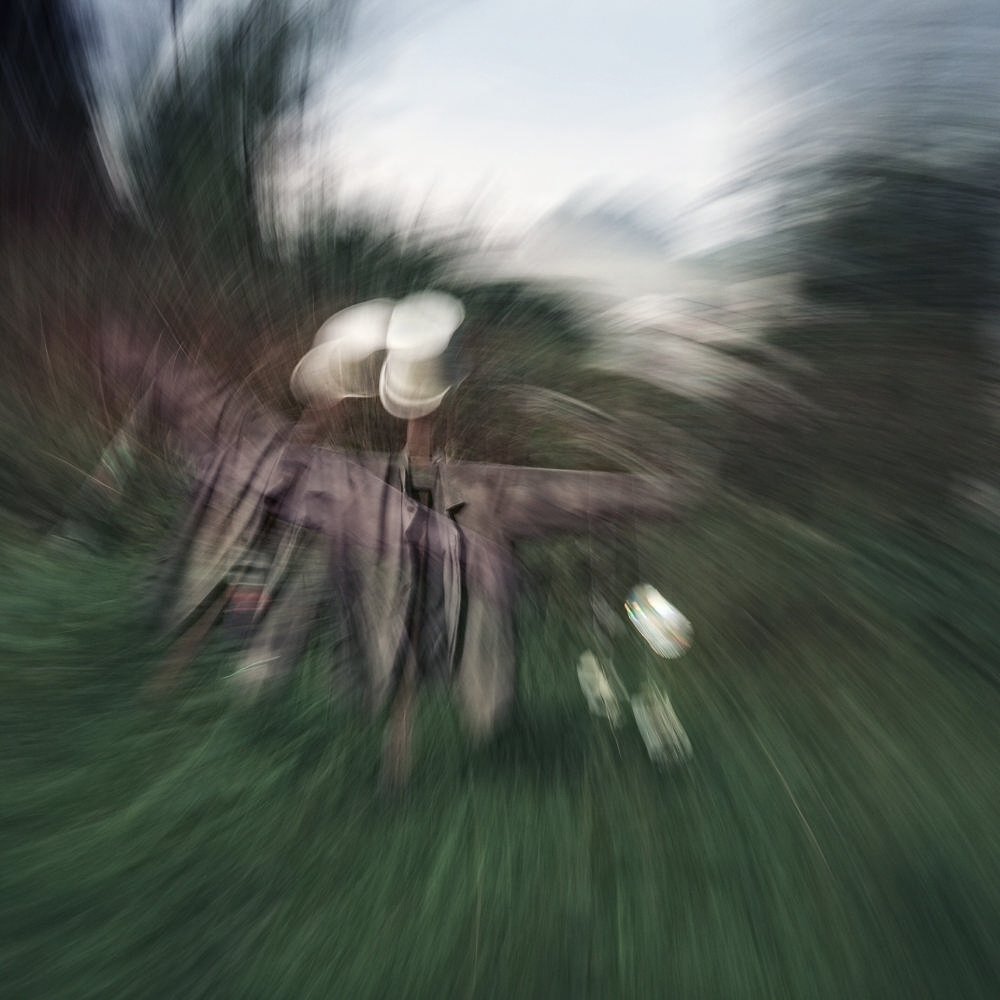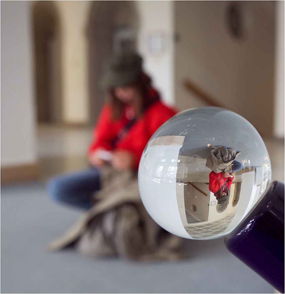 Kulička je umístěná do pravého dolního silného obrazového bodu. Roli hraje barva – červená bunda upoutá pozornost. Zde nevadí, že většina plochy obrazu je mimo ostrost, naopak, soustřeďuje to pozornost na děj uvnitř koule. Postava je pečlivě začleněná do průčelí budovy za ní. Pokud mám nějakou pochybnost, pak je to činnost té osoby. Drží v ruce nějaký papírek a zřejmě si čte. Je to trochu nepochopitelné – vypadá to jako mimoděk zachycený momentní snímek a jistě to tak nebylo, aranžmá asi bylo pečlivé. Proč si postava čte? Možná ale, že i tato záhada přispívá ke kouzlu fotky. Další dvě fotky mají jednu autorku, Zuzku Vitvarovou. Opilý strašák, jak se zdá, vznikl škubnutím fotoaparátu. Ale ono to tak jednoduché určitě nebylo…