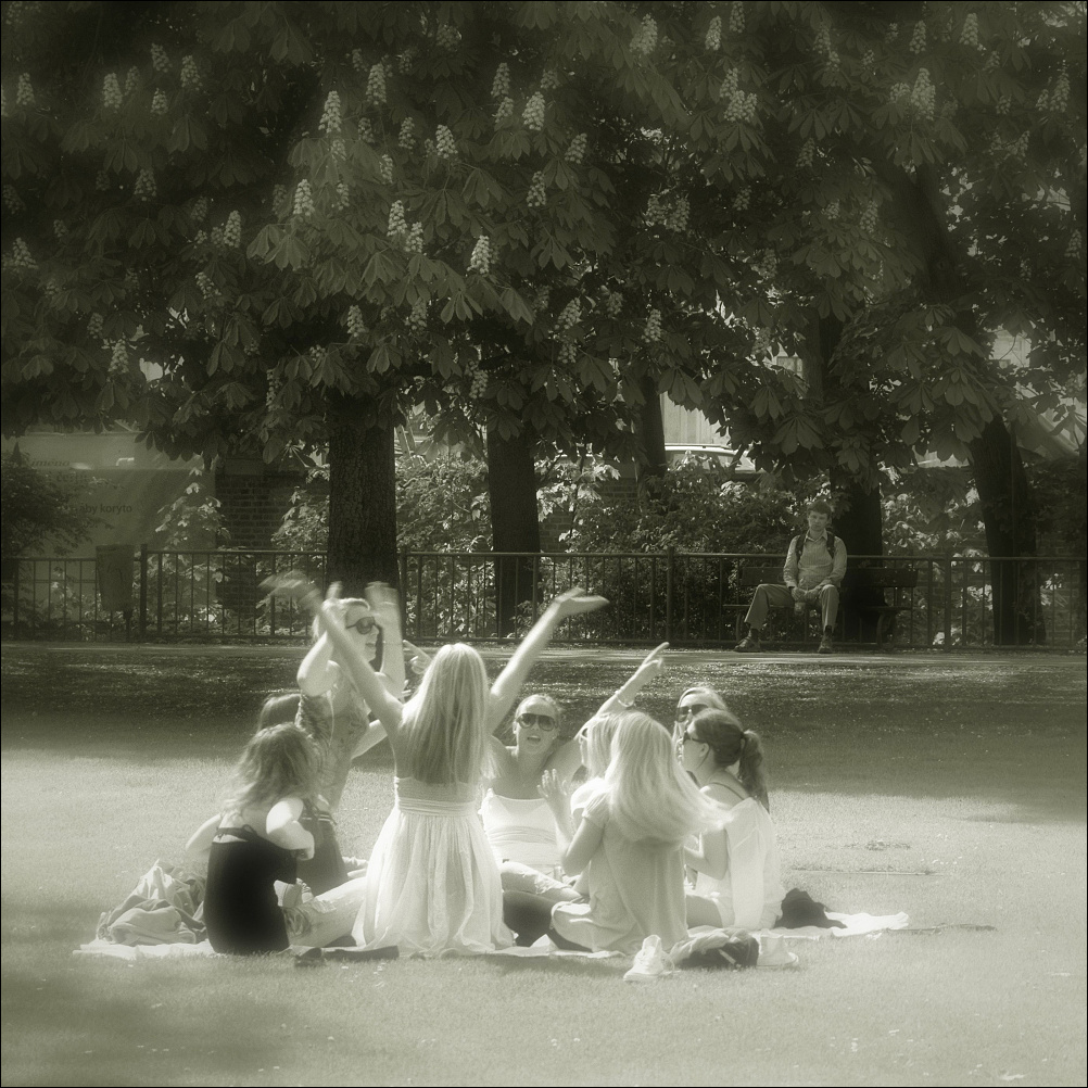 A zase: nápad a znalost, jak ho realizovat. Tentokrát jde o volbu tonality a o změkčení scény filtrem. Je to příklad fotky, kdy použití filtru je dopředu zamýšlené, je tedy součástí tvůrčího procesu. Není to tak, že „vyfotím mordu a filtr z toho udělám umění“. Autorka jistě už na místě samém při aranžování skupiny věděla, že filtr použije . No a efekt se dostavil.