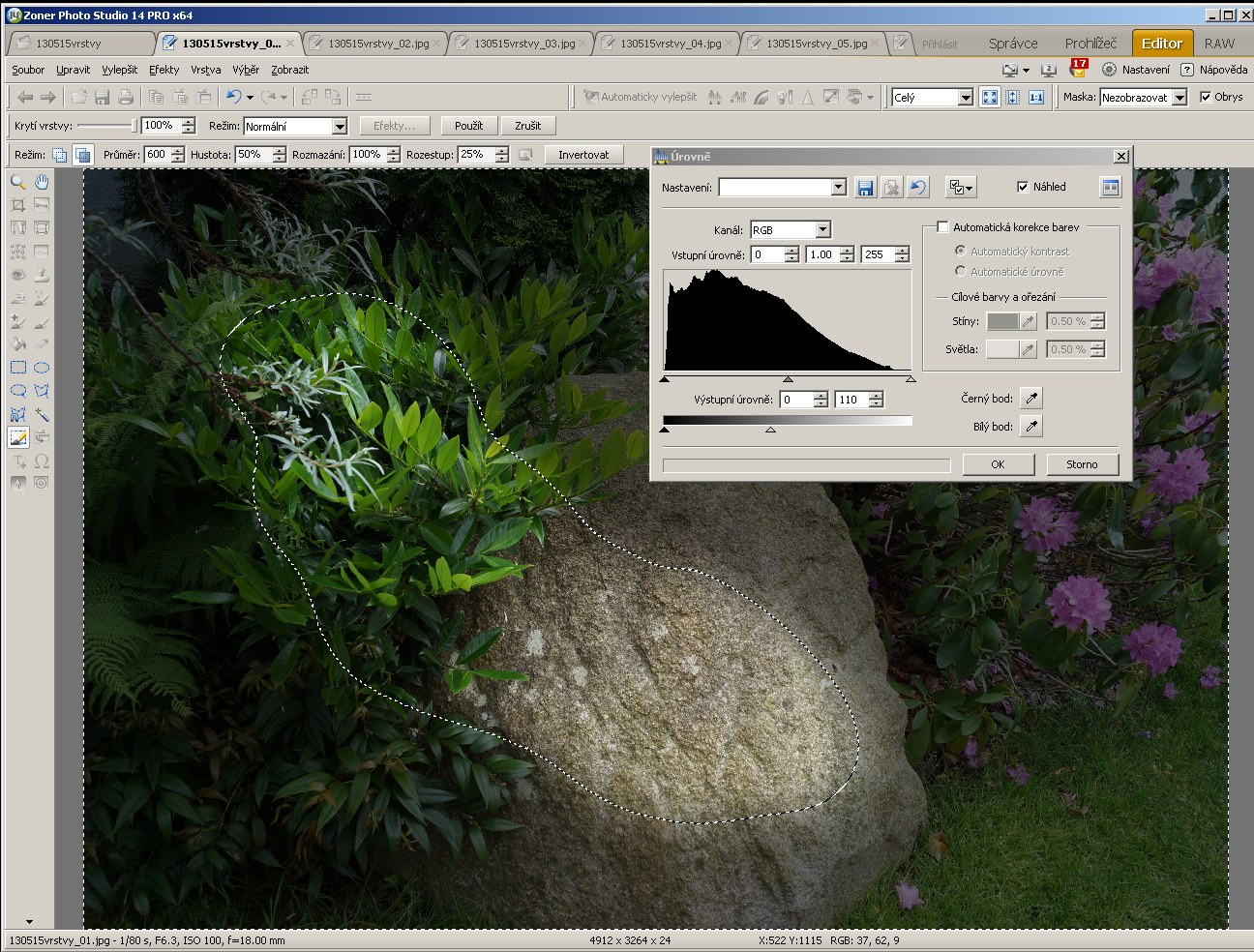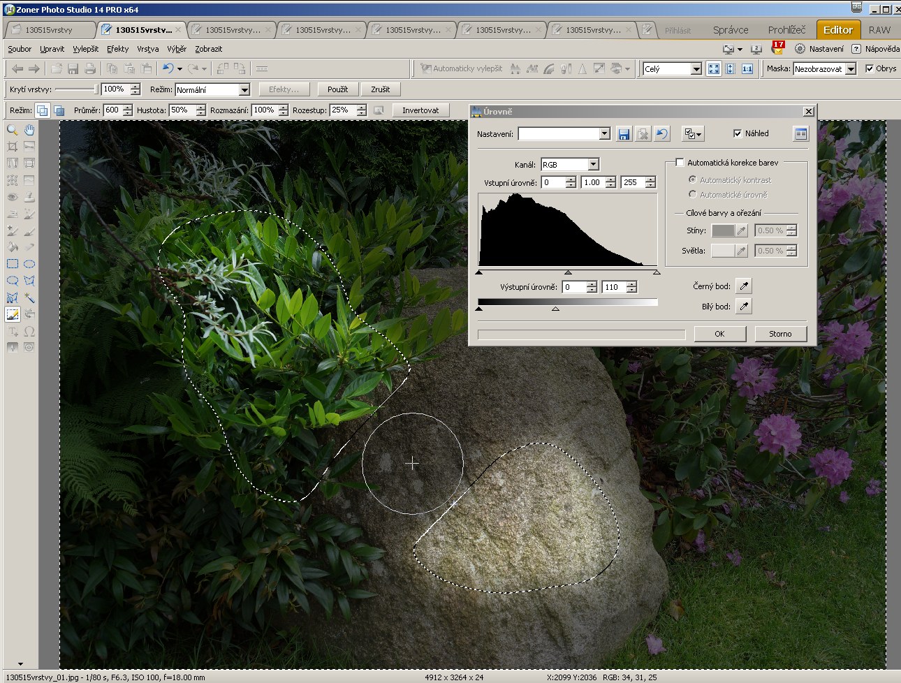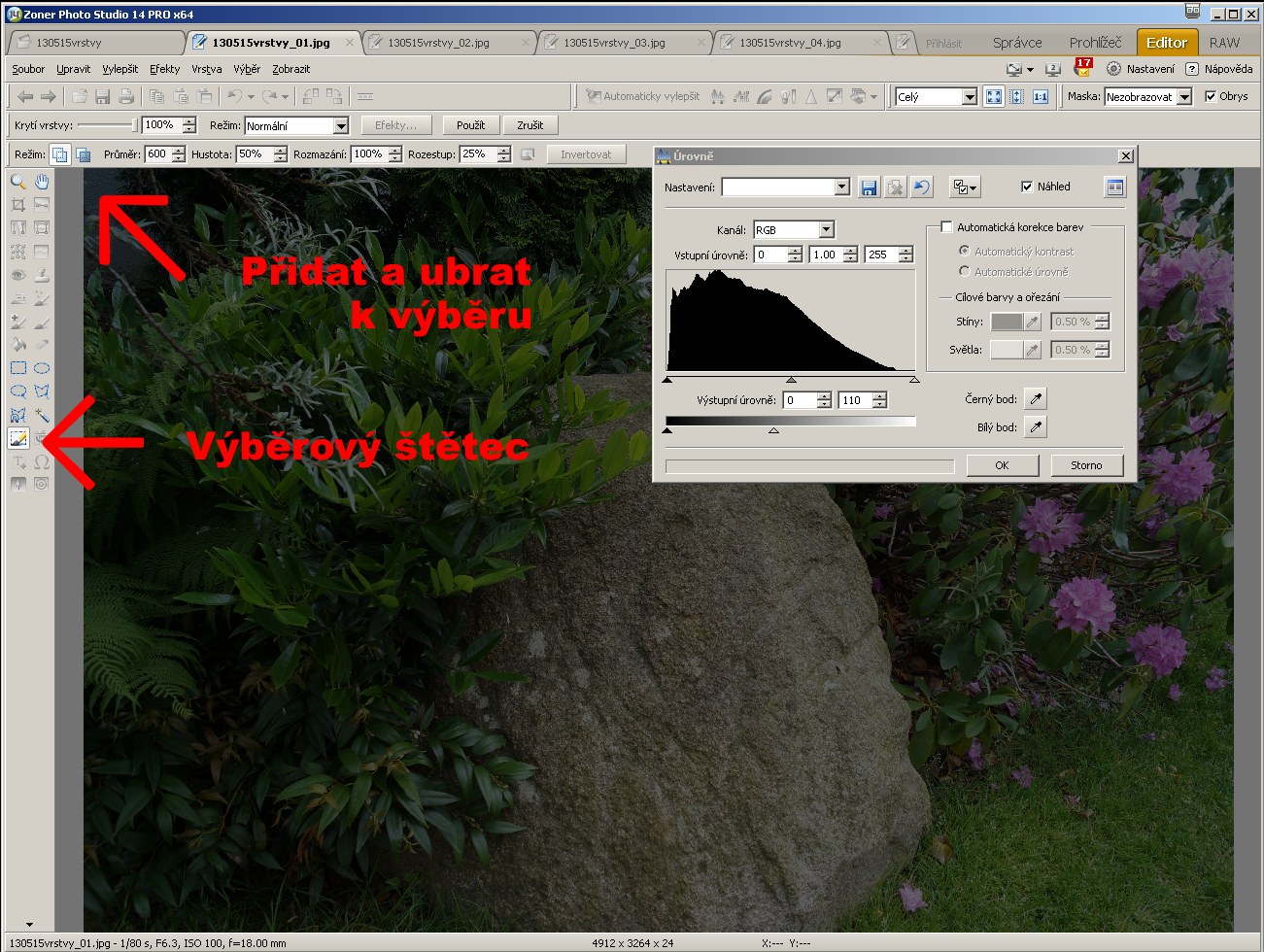 Když se spletu, udělám chybu, štětcem v režimu Přidat k výběru mohu obrázek na světlém místě zase ztmavit.