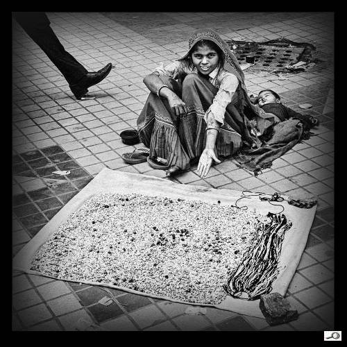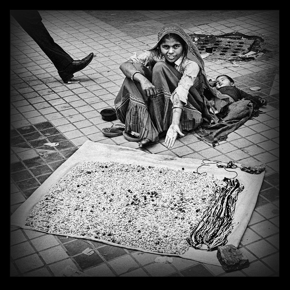 Toto je jistě street foto, Bedřich Helan zachytil Indickou madonu s dítětem. Výtečná sociální fotografie, skvěle tam hraje noha spěchajícího pána – nepochybujeme, že si žádný korálek nekoupí. Komponováno do čtverce, zvýrazněno vinětací.