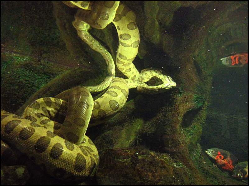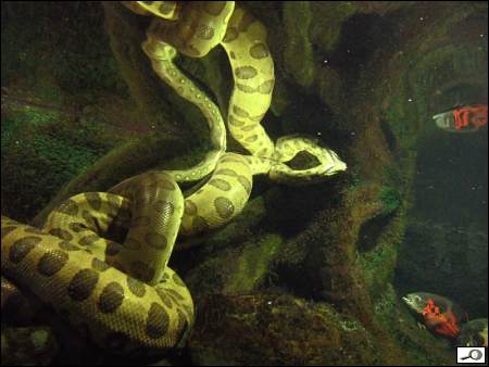 Někdy je ale možné zrcadlení využít. Na následujícím snímku jsem využil zrcadlení vodní hladiny. Tihle dva propletení hadi podřimují v akváriu v pavilonu šelem. Nejdřív jsem zkoušel fotit jak hlavičky, tak těla, ale pak jsem si všiml toho odrazu – a ten vytvořil podivuhodný, těžko čitelný útvar: