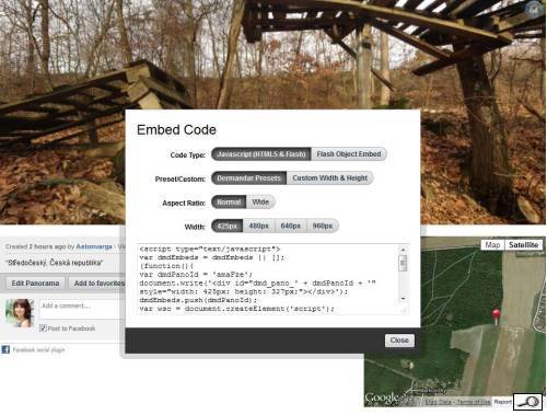 App komunikuje s domovským serverem Dermandar. Na něj můžete nahrávat panoramata. Do nějakého Flickru nebo Picassy to mná daleko, panorama veřejně přístupná se zobrazují více méně nahodile, nebo podle blízkosti (je tu lokalizace, tady v obrázku je zakukleno místo, kde byl pořízen) a pak jsou tu čerstvá panorama – ale ta kupodivu nesou pozdější datum než ona nahodilá. S tím si netřeba lámat hlavu, podstatné je něco jiného: uděláte si tu obvyklým způsobem účet a pak si můžete panorama promítnout, uvidíte mapu a hlavně, získáte script, který si můžete umístit do webové stránky nebo dát na Facebook.