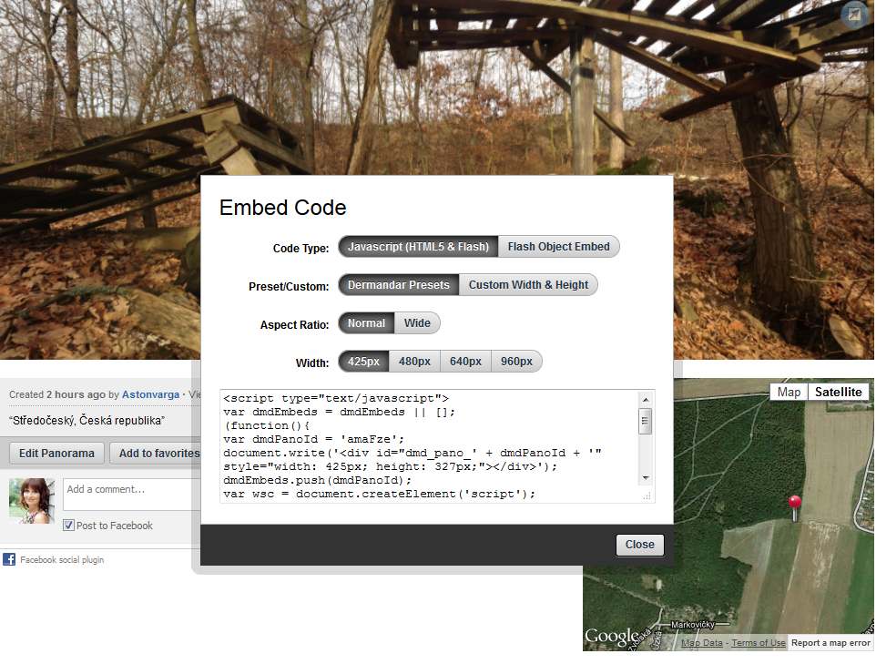 App komunikuje s domovským serverem Dermandar. Na něj můžete nahrávat panoramata. Do nějakého Flickru nebo Picassy to mná daleko, panorama veřejně přístupná se zobrazují více méně nahodile, nebo podle blízkosti (je tu lokalizace, tady v obrázku je zakukleno místo, kde byl pořízen) a pak jsou tu čerstvá panorama – ale ta kupodivu nesou pozdější datum než ona nahodilá. S tím si netřeba lámat hlavu, podstatné je něco jiného: uděláte si tu obvyklým způsobem účet a pak si můžete panorama promítnout, uvidíte mapu a hlavně, získáte script, který si můžete umístit do webové stránky nebo dát na Facebook.