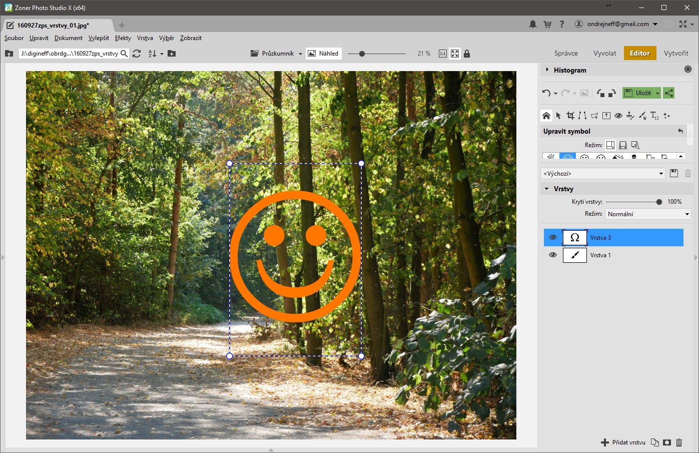 Přidat symbol jsem do obrázku mohl i v předchozích verzích ZPS. Jenže rozdíl je v tom, že ještě v loňské verzi ZPS18 jsem kliknul na Použít a symbol byl na tom místě a v té velikosti a té barvě, jak jsem ho tam vložil a už se s ním nedalo nic dělat. Jako bych ho majzlíkem a dlátem vytesal. Zde s ním mohu kdykoli cokoli provést, mohu ho i nahradit jiným symbolem, mohu ho přemístit a zmenšit a zvětšit a zešišatět – kdykoli! Když uložím rozpracovaný obrázek v nativním formátu *.ZPS, mohu ho otevřít třeba za týden a znovu se můžu k symbolu vrátit a měnit ho. Zkrátka, ty vrstvy jsou otevřené jakékoli úpravě, bez ohledu na to, jestli jsou dvě nebo jich je dvacet.